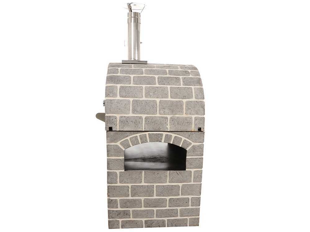 Die Außenverkleidung besteht aus Kunstharz, das die optische Wirkung von Stein bietet, ohne die Struktur zu schwer zu machen. Dank der großen schwenkbaren Räder lässt sich der Backofen leicht an jeden beliebigen Ort bewegen.