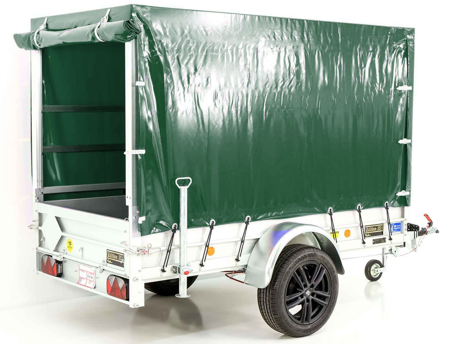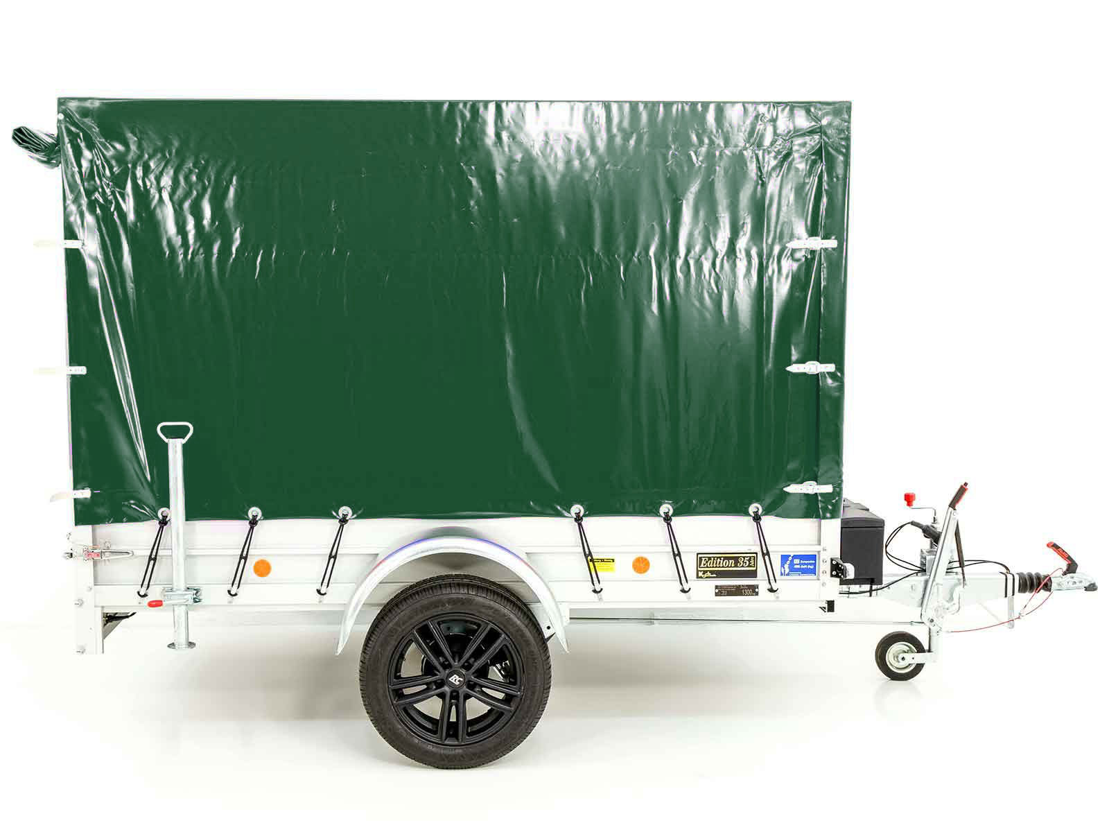 Der -Anhänger „Edition 35“ Typ 4.13 in Grün ist ein leichter Aluminium-Anhänger mit einer Nutzlast von 1060 kg und einem zulässigen Gesamtgewicht von 1300 kg. Dieser hochwertige Planenanhänger bietet neben seiner robusten Bauweise eine Vielzahl von praktischen Eigenschaften und einzigartigen Merkmalen: