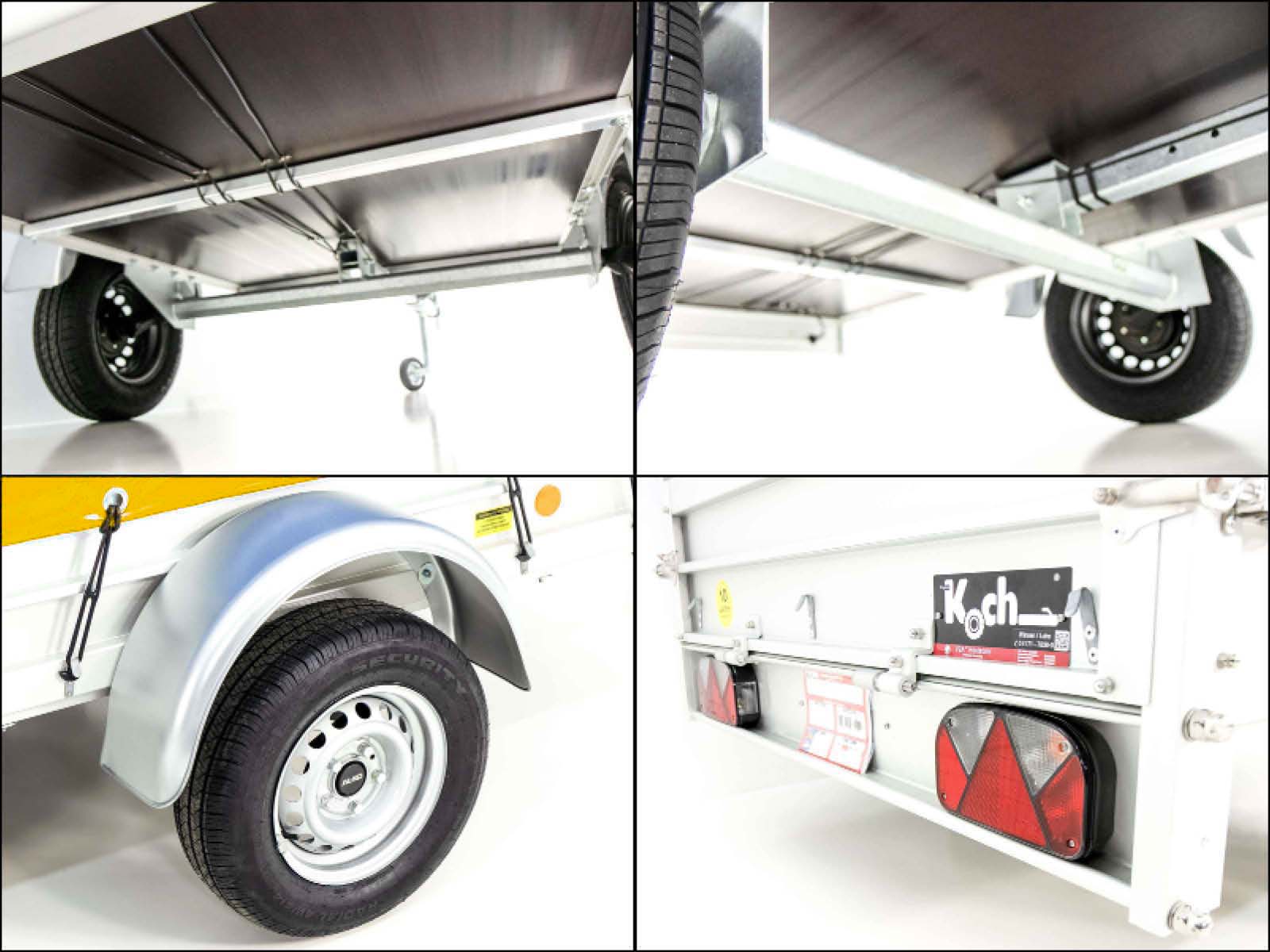 Der Anhänger Typ U4 in Gelb bietet kompakte Maße und eignet sich ideal für leichte bis mittlere Transporte mit einer maximalen Nutzlast von 570 kg und einem zulässigen Gesamtgewicht von 750 kg. Er überzeugt durch viele hochwertige Merkmale, die auch bei kleineren Anhängern nicht selbstverständlich sind: