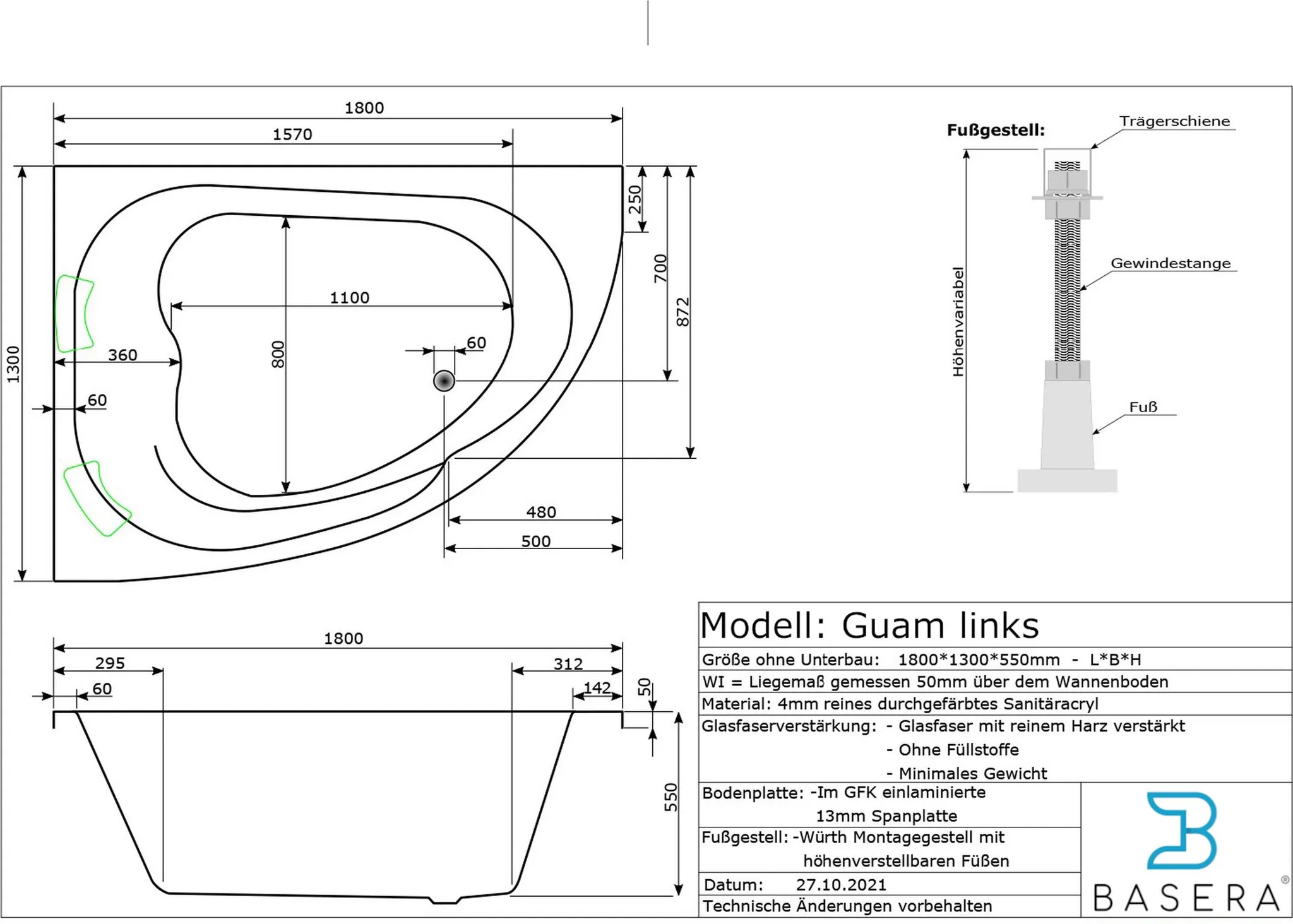 Dank der 1000 Watt Power Heizung vom Markenhersteller dhW mit 220V/50HZ wird es nie kalt. Sobald die Massagedüsen eingeschaltet sind, wird das Wasser auch bei einem längeren Badegang warm gehalten. Der Whirlpool besteht aus hochwertigem reinem Sanitäracryl. Dieses Qualitätsmerkmal sorgt für eine optimale Wärmespeicherung sowie für ein angenehmes, warmes Hautgefühl beim Einsteigen in die Badewanne. Darüber hinaus wird im Laminierverfahren eine Glasfaserverstärkung auf die Außenseite der Wanne aufgetragen. Einzeln höhenverstellbare Füße schaffen einen Bodenausgleich von bis zu 10 cm. Das Fußgestell ist aus massivem rostfreiem Stahl und alle Eisenkleinteile sind von der deutschen Qualitätsmarke Würth.