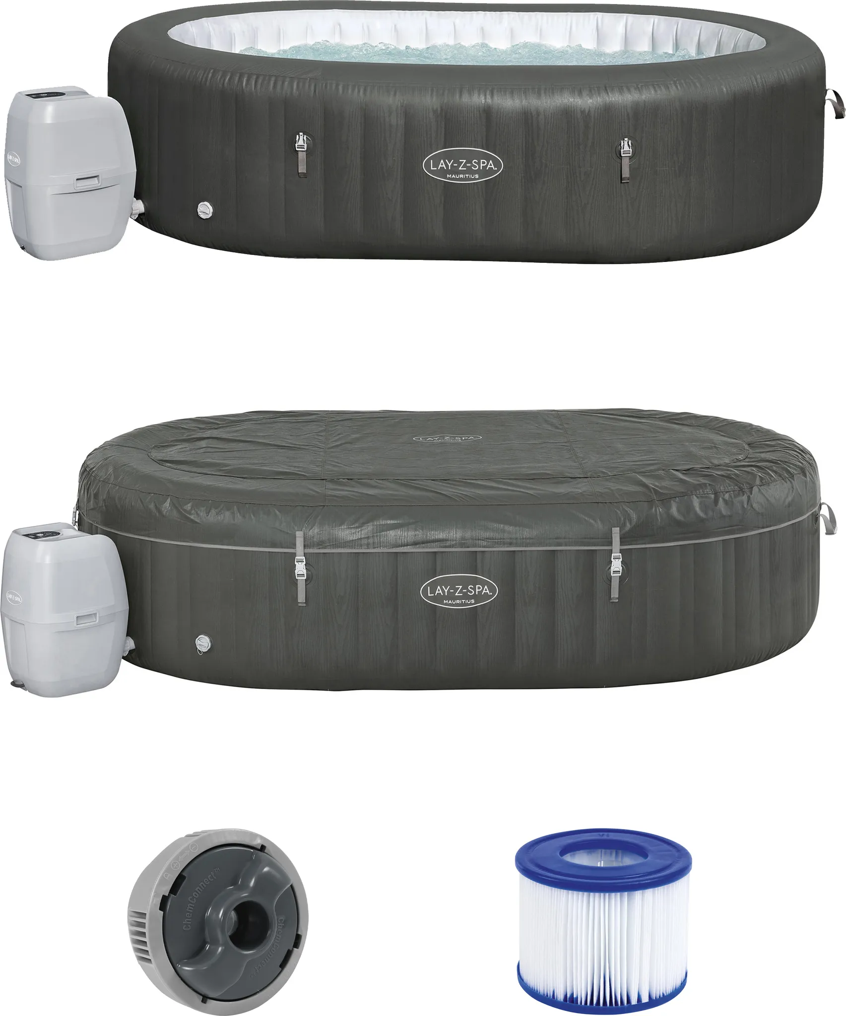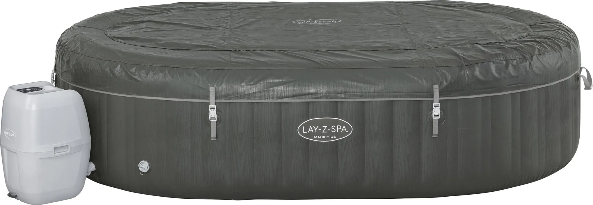 Mit dem ovalen LAY-Z-SPA® Mauritius AirJet™ in dezenter basaltgrauer Holz-Optik überreichen wir Dir den Schlüssel zu Deinem Spa (270 x 180 x 71 cm), den Du mit bis zu 7 Personen genießen kannst. Dieser Spa ist nicht nur imposant, sondern steht auch sinnbildlich für Entspannung. Also, lass Dir von den 180 Luftdüsen im 40°C warmen Wasser eine traumhafte Massage geben – 365 Tage im Jahr! Mithilfe des Frostwächters braucht Dein Whirlpool keine Winterpause: Sobald die Wassertemperatur auf 6°C sinkt, wird das Heizsystem ein- und bei 10°C wieder ausgeschaltet. Ähnlich einfach ist der Aufbau des Spas, den die Multifunktionspumpe übernimmt. Die Kommandozentrale kannst Du über das hochklappbare Soft Touch-Display steuern und somit u. a. Filter- & Heizfunktion regulieren. Für mehr Sicherheit sorgen die Tastensperre & die kindersicheren Verschlüsse der Thermoabdeckung. Den Poolboy brauchst Du nicht, denn ChemConnect™ reguliert die Dosierung & Verteilung der Poolchemie. Zudem bietet die Lamellenstruktur der Filterkartusche genug Oberfläche zur Wasserfilterung. Plus: Das reißfeste & formbeständige DuraPlus™-Material sorgt für Langlebigkeit. Im Inneren des Spas ist es eine Y-Beam-Luftsteg-Konstruktion, die besten Halt bietet. Wenn Du den Spa nicht nutzt, schützt die Abdeckung Deinen Whirlpool z. B. vor Temperaturverlust. Keine Lust mehr auf Wellness? Mithilfe des Ablassrohrs mit Gartenschlauchadapter kannst Du das Wasser einfach ablassen. Danach erleichtert Dir der Entlüftungsadapter den Abbau, ohne dass Dir dabei die Puste ausgeht. Bist Du überzeugt? Dann in den Spa, fertig, los!