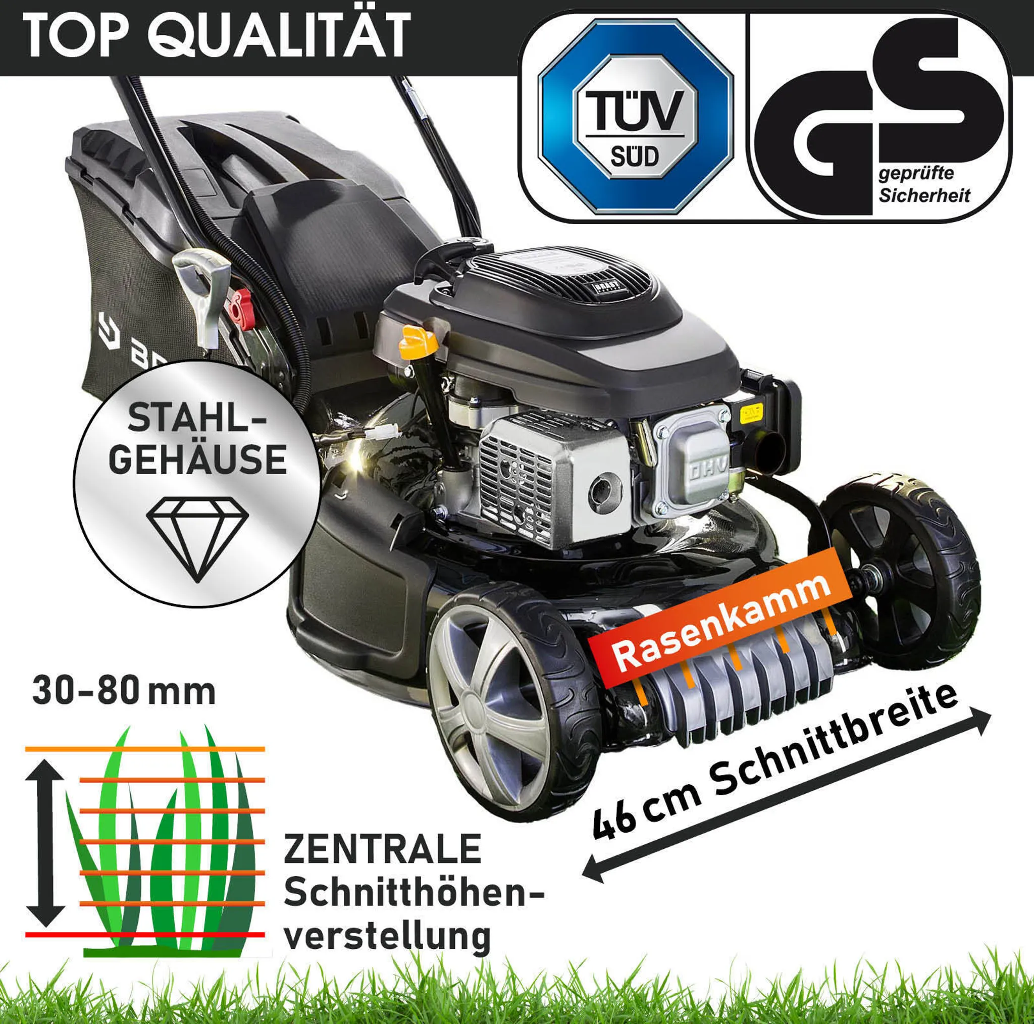 Der BRAST Benzin Rasenmäher beeindruckt mit einem starken Motor und herausragenden Schnittergebnissen: