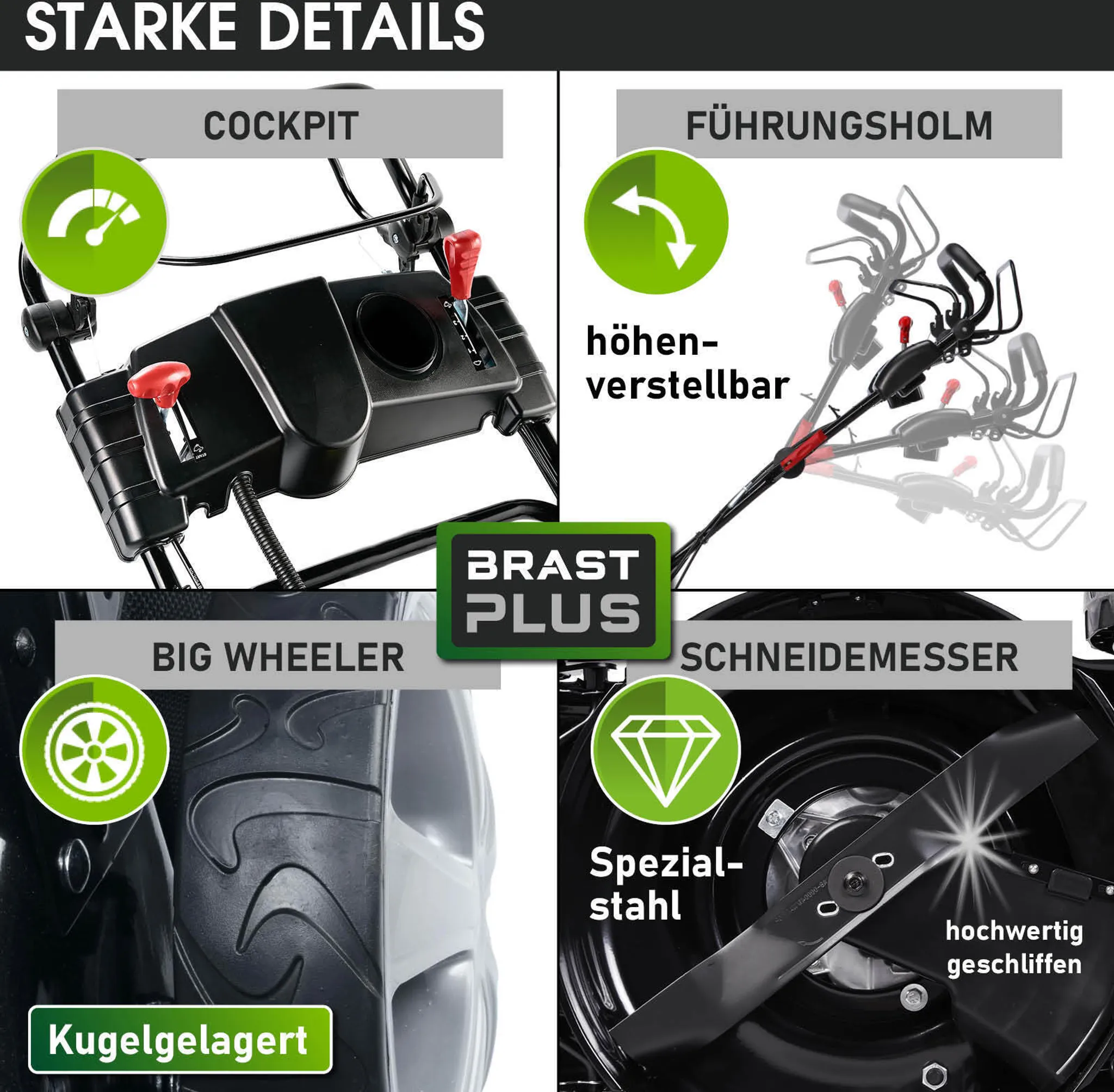 • Starke Details: Der Benzinrasenmäher mit Antrieb verfügt über kugelgelagerte Big Wheeler Räder für leichtes Fahren auf unebenen Flächen, einem ergonomisch geformten & stufenlos höhenverstellbaren Führungsholm mit Softgriff, dem dreifach einstellbaren Chassis-Gestänge und dem Easy-Clean-Reinigungssystem. Der praktische Rasenkamm richtet Grashalme für einen präzisen Schnitt auf und im Cockpit befindet sich der Geschwindigkeitsregler, Motodrehzahlregler, ein Getränkehalter, Akkufach & Startknopf