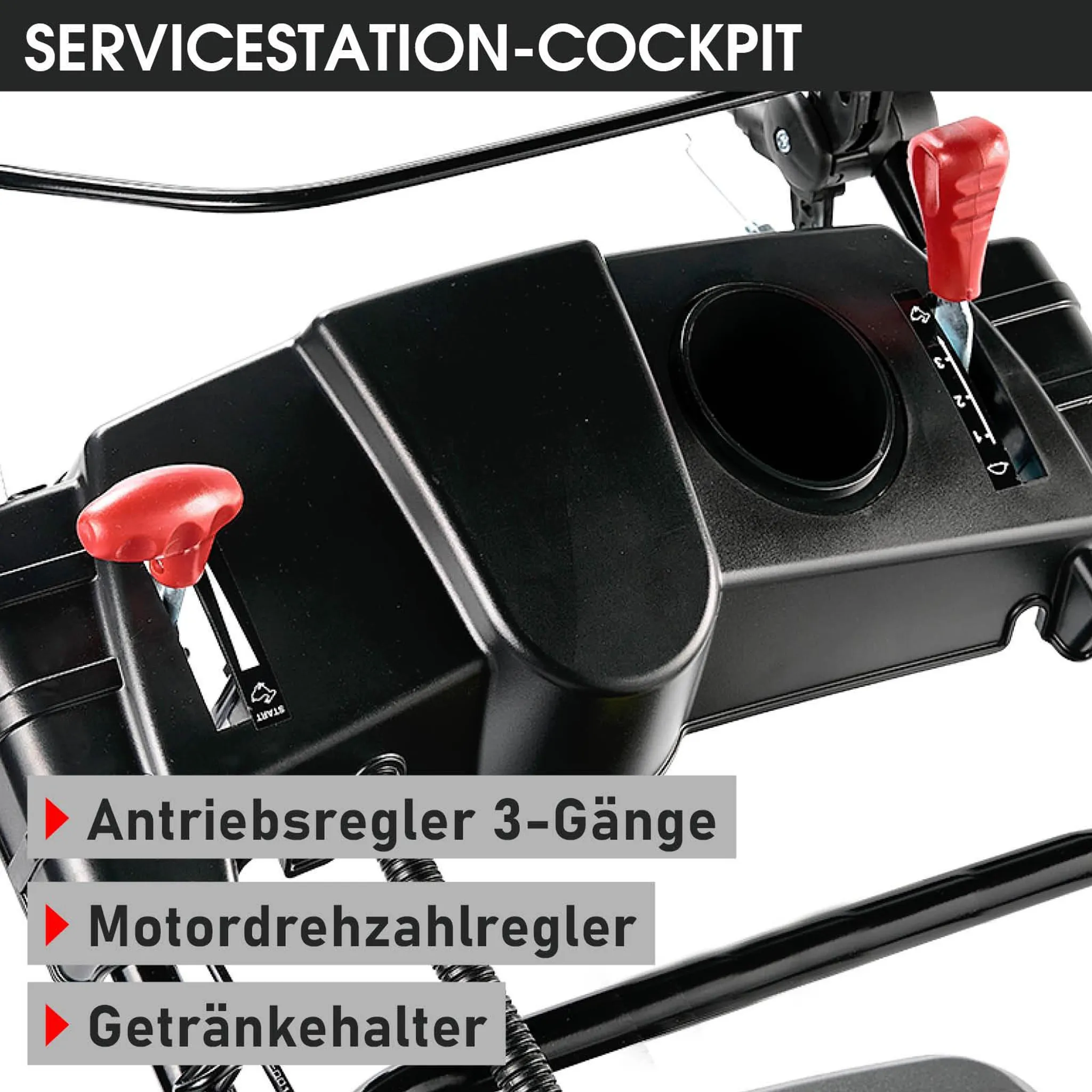 • Cockpit am Führungsholm mit Motordrehzahlregler, Geschwindigkeitsregler, Getränkehalter, Akkufach und Startknopf