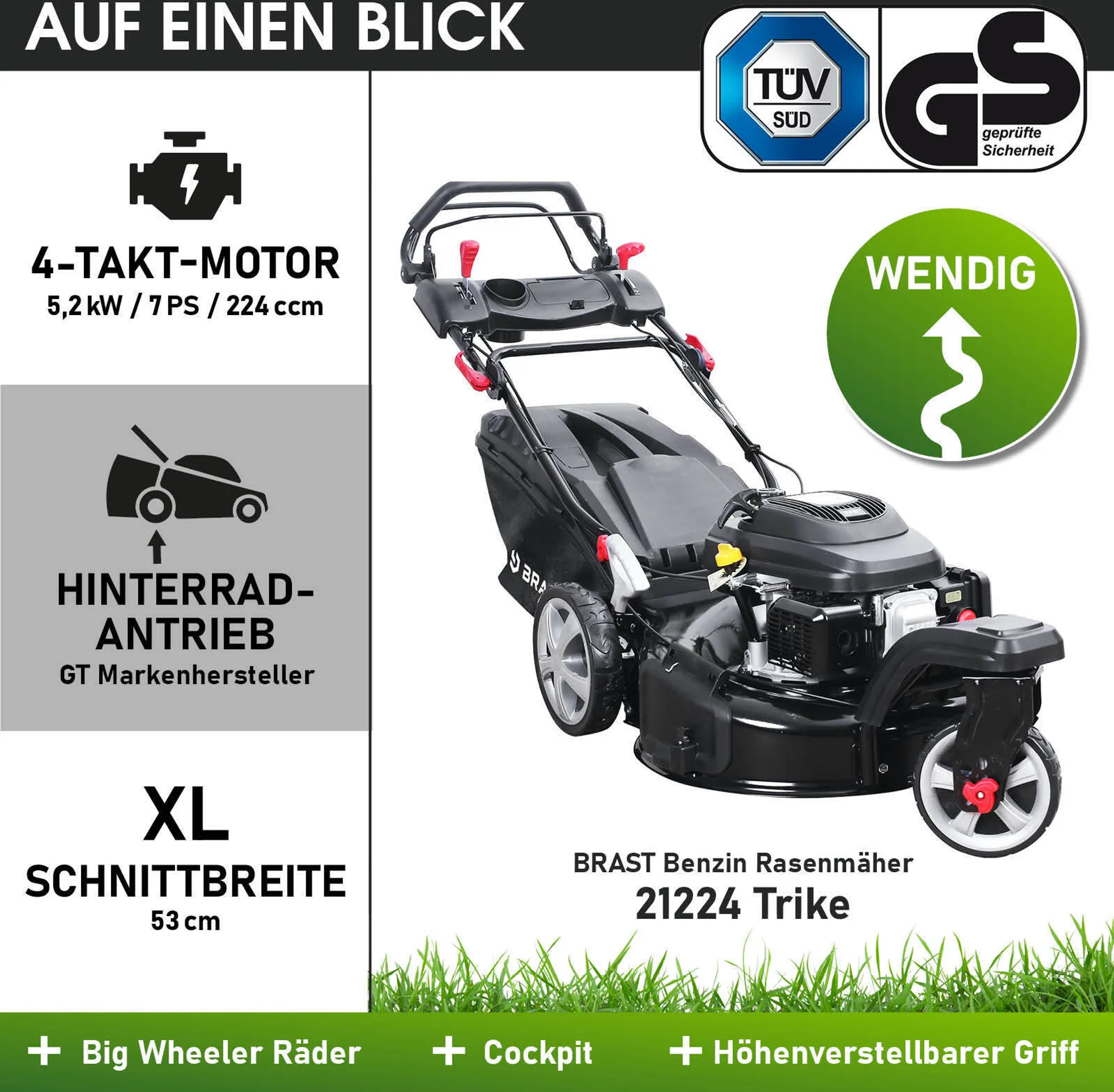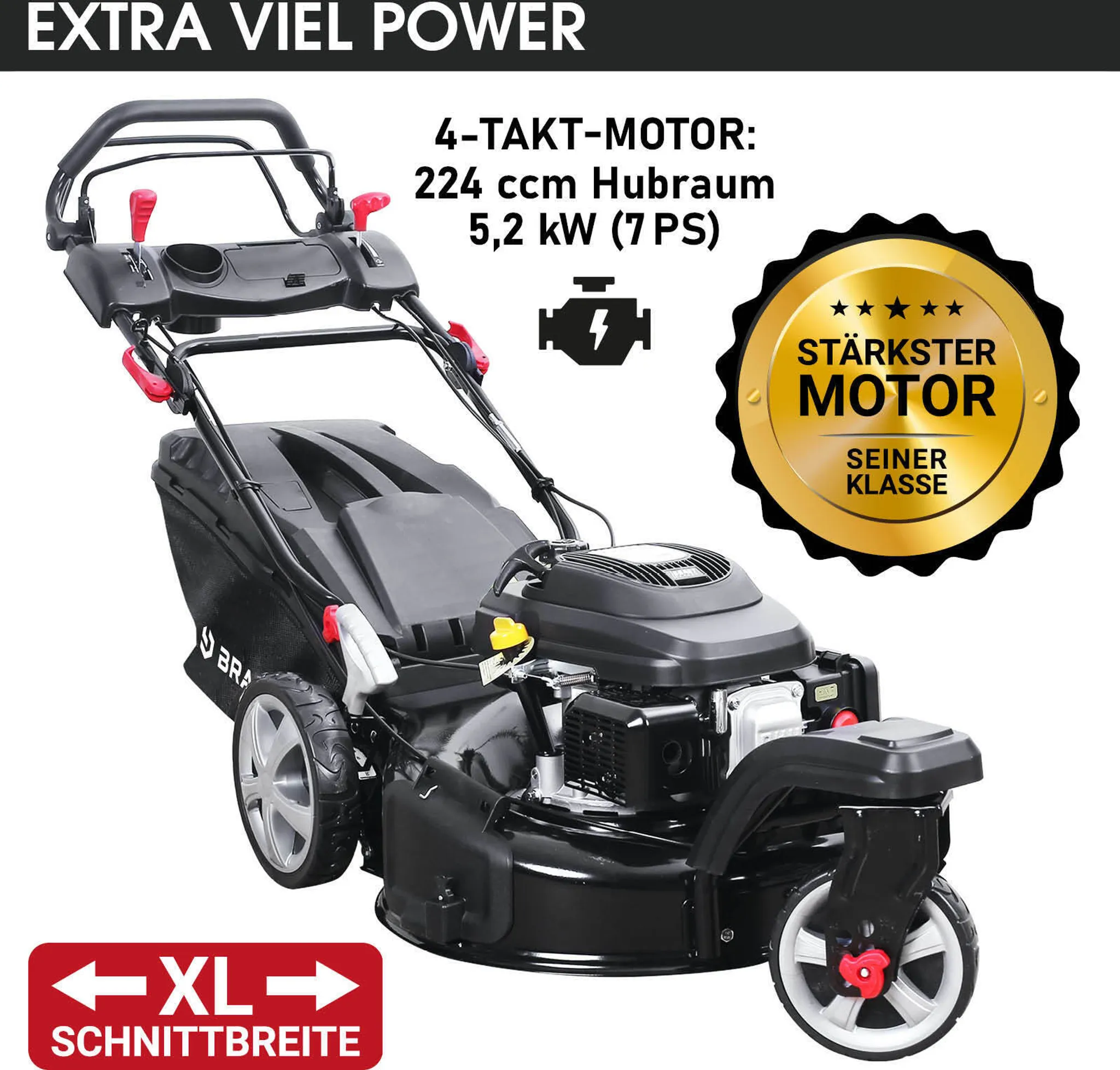 - Technische Daten 4-Takt Motor, 224cm³, 5,2kW (7PS), 2.800U/min, Schnittbreite 53cm, 60L Grasfangsack, Rad vorne: 203mm 360° drehbar, Räder hinten: 254mm, Hinterräder mit zentral 6-stufiger & Vorderrad mit manueller 6-stufiger Schnitthöhenverstellung 30-80mm, Stahlgehäuse, Easy-Clean, Maße aufgebaut 150x54x170cm, Gewicht 34,8kg, Schneidemesser aus Spezialstahl, manuell steuerbarer Motordrehzahlregler, Vorderrad zum Geradeausfahren per Klick fixierbar