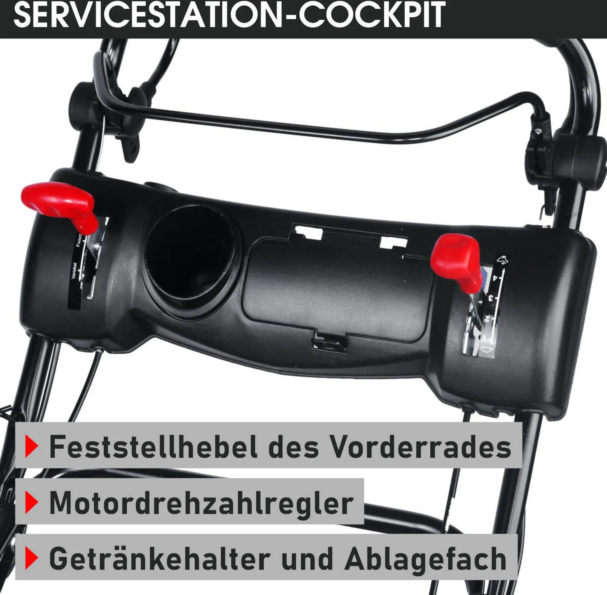 - Cockpit am Führungsholm mit Motordrehzahlregler, Ablagefach & Getränkehalter