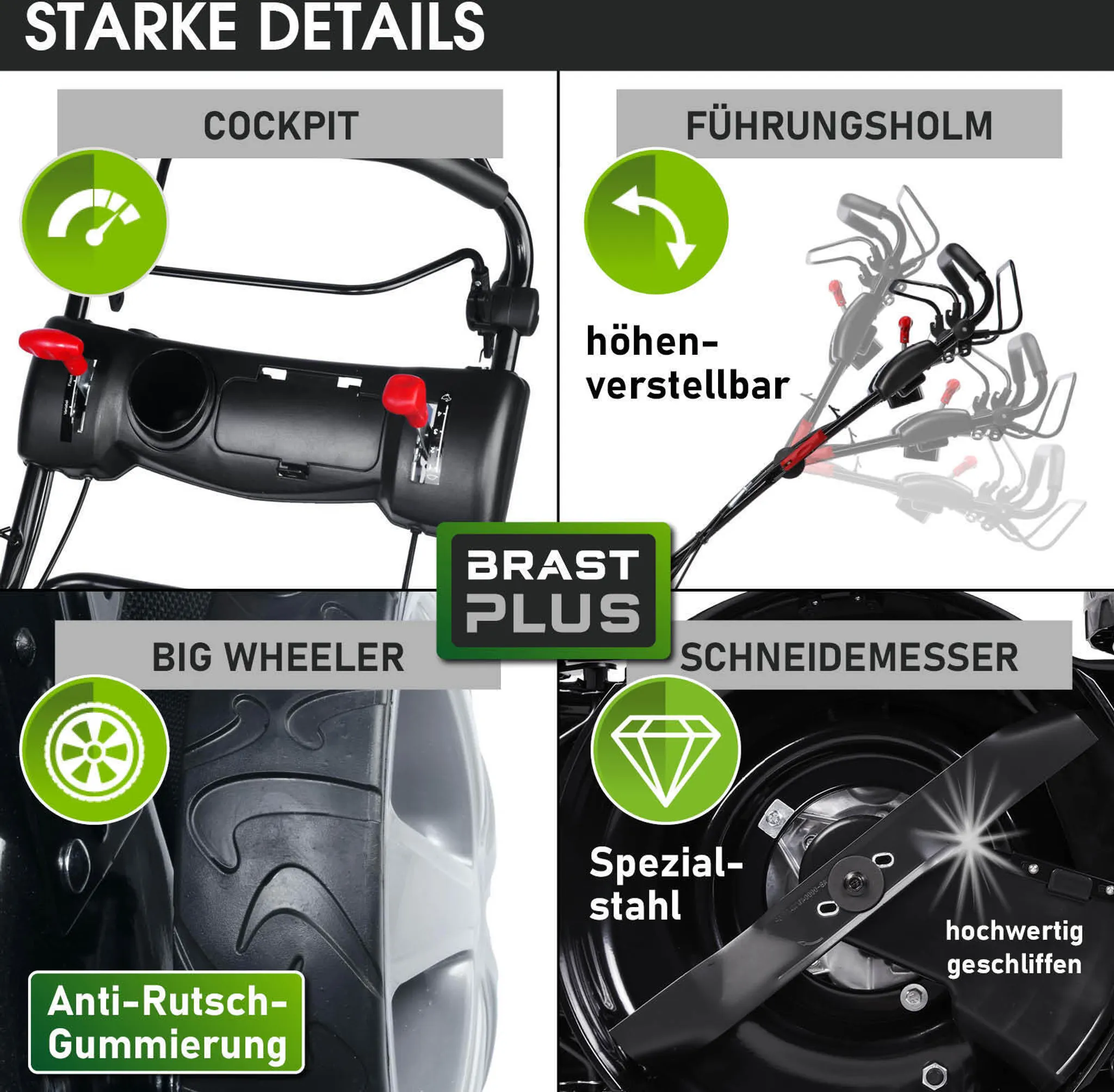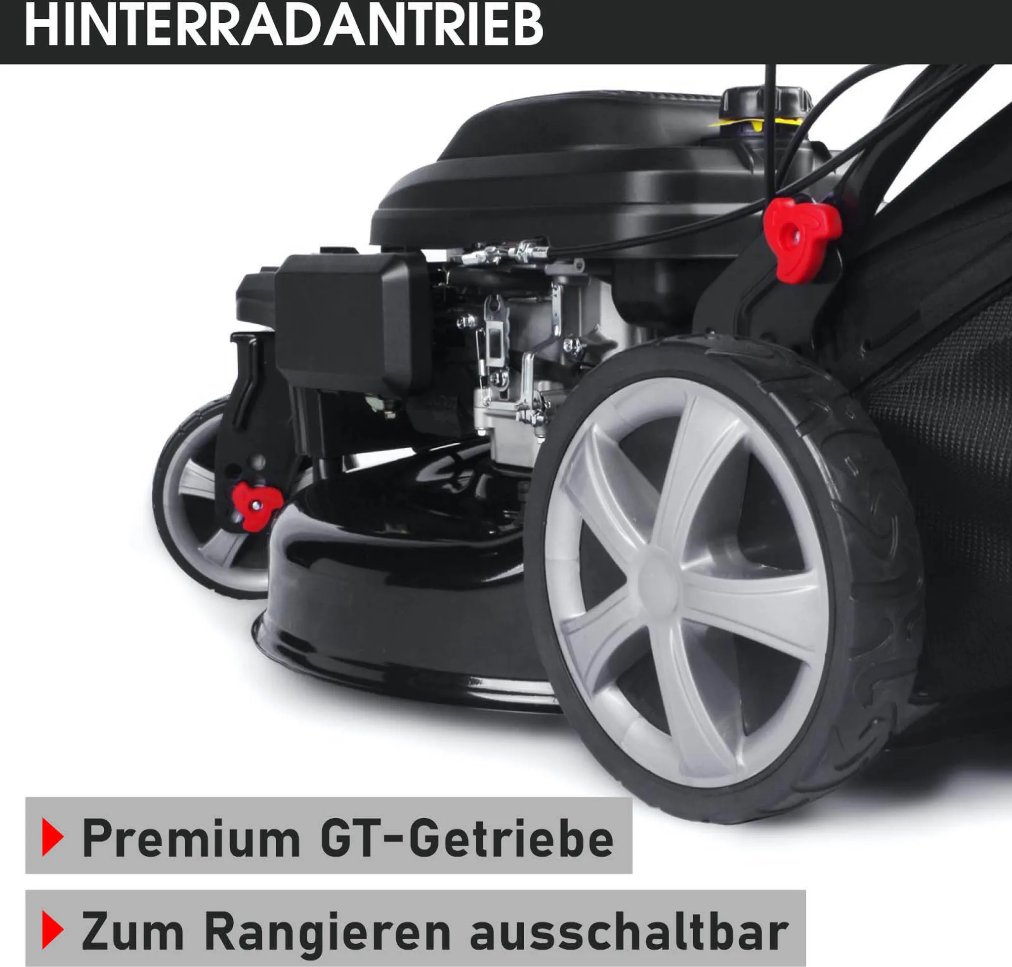 - Starke Details Der Benzinrasenmäher mit Antrieb verfügt über kugelgelagerte Big Wheeler Räder mit Grip-Profil für leichtes Fahren auf unebenen Flächen, einem stufenlos höhenverstellbaren Führungsholm, dem dreifach einstellbaren Chassis-Gestänge und dem Easy-Clean-Reinigungssystem. Das Cockpit beinhaltet den manuell steuerbaren Motordrehzahlregler, Vorderrad-Steuerungshebel sowie Ablagefach und Getränkehalter
