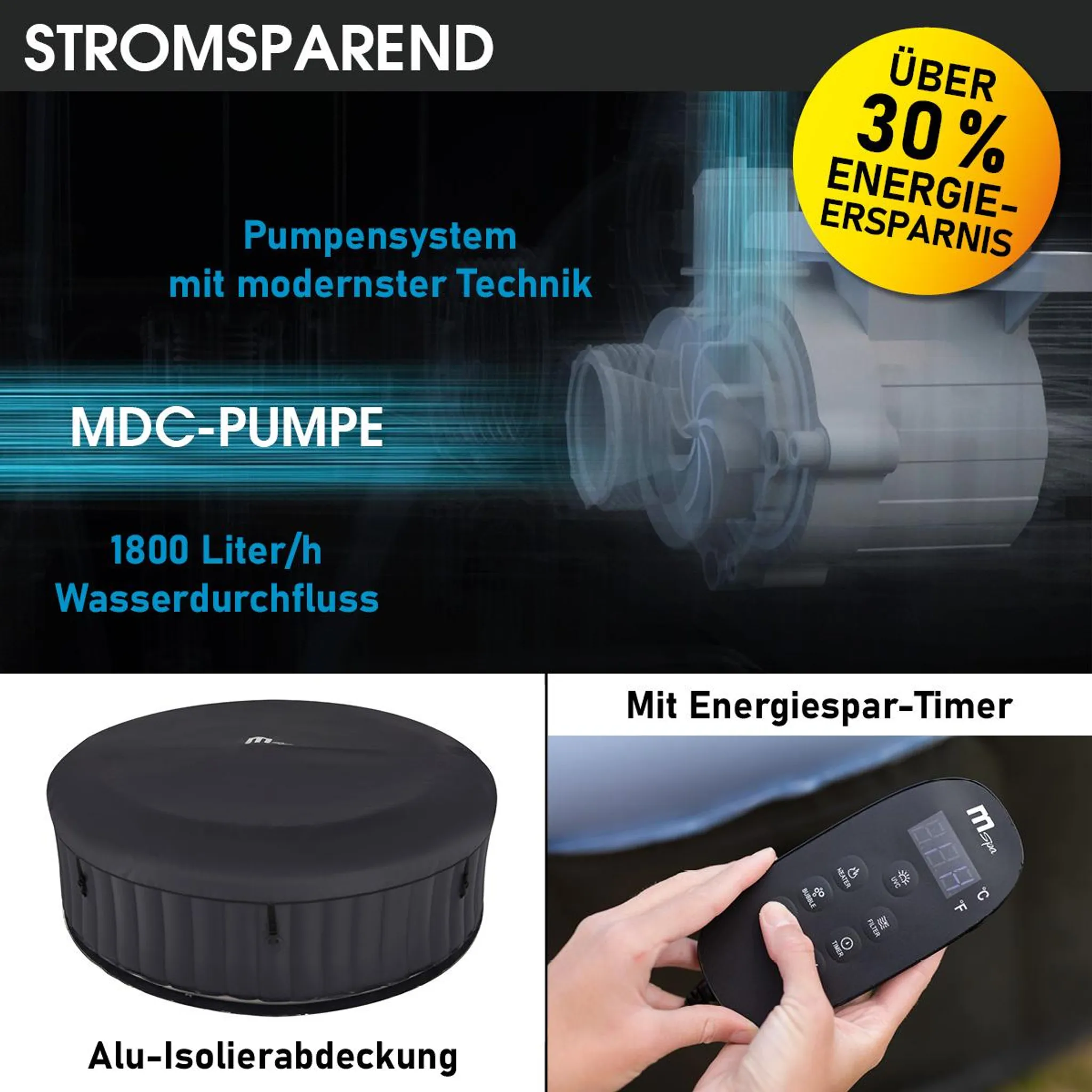 - Einfach, schnell & sicher: Unser MSpa Whirlpool BERGEN 8 Personen zeichnet sich durch bequemen, schnellen Aufbau dank der Schnellaufblas-Funktion aus. Die wasserdichte Vollfunktions-Fernbedienung ermöglicht die einfache Steuerung, inkl. Energiespar-Timer. Der Anti-Rutsch-Boden bietet ein sicheres Ein & Aussteigen
