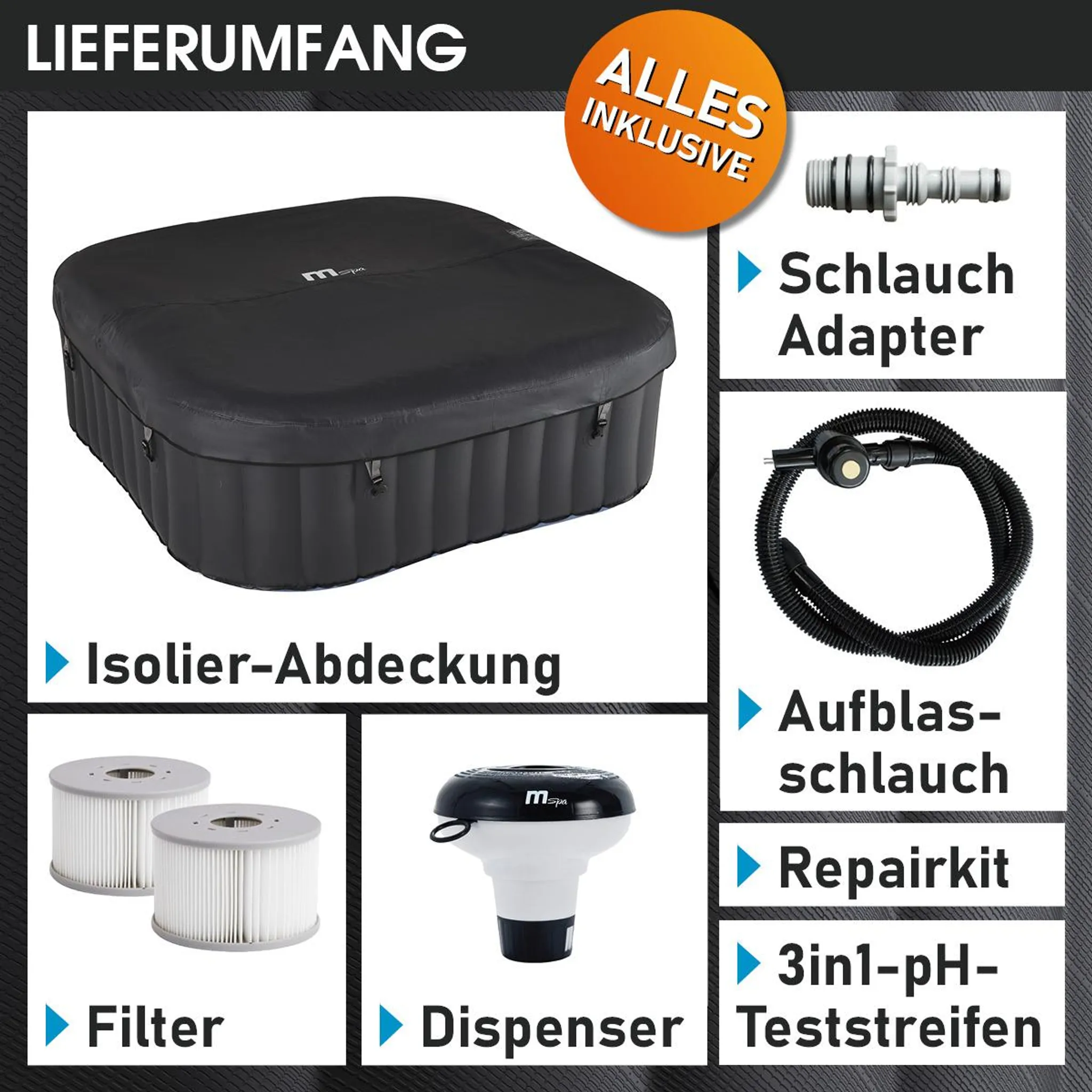 - Einfach, schnell & sicher: Unser MSpa Whirlpool TEKAPO 4 Personen zeichnet sich durch bequemen, schnellen Aufbau dank der Schnellaufblas-Funktion aus. Die wasserdichte Vollfunktions-Fernbedienung ermöglicht die einfache Steuerung inkl. Energiespar-Timer. Mit der Kindersicherung können Sie alle Funktionen des aufblasbaren Whirlpools sicher vor unerlaubtem Zugriff schützen. Der Anti-Rutsch-Boden bietet ein sicheres Ein- und Aussteigen, der FI-Schutzschalter ein unbeschwertes Spa-Erlebnis