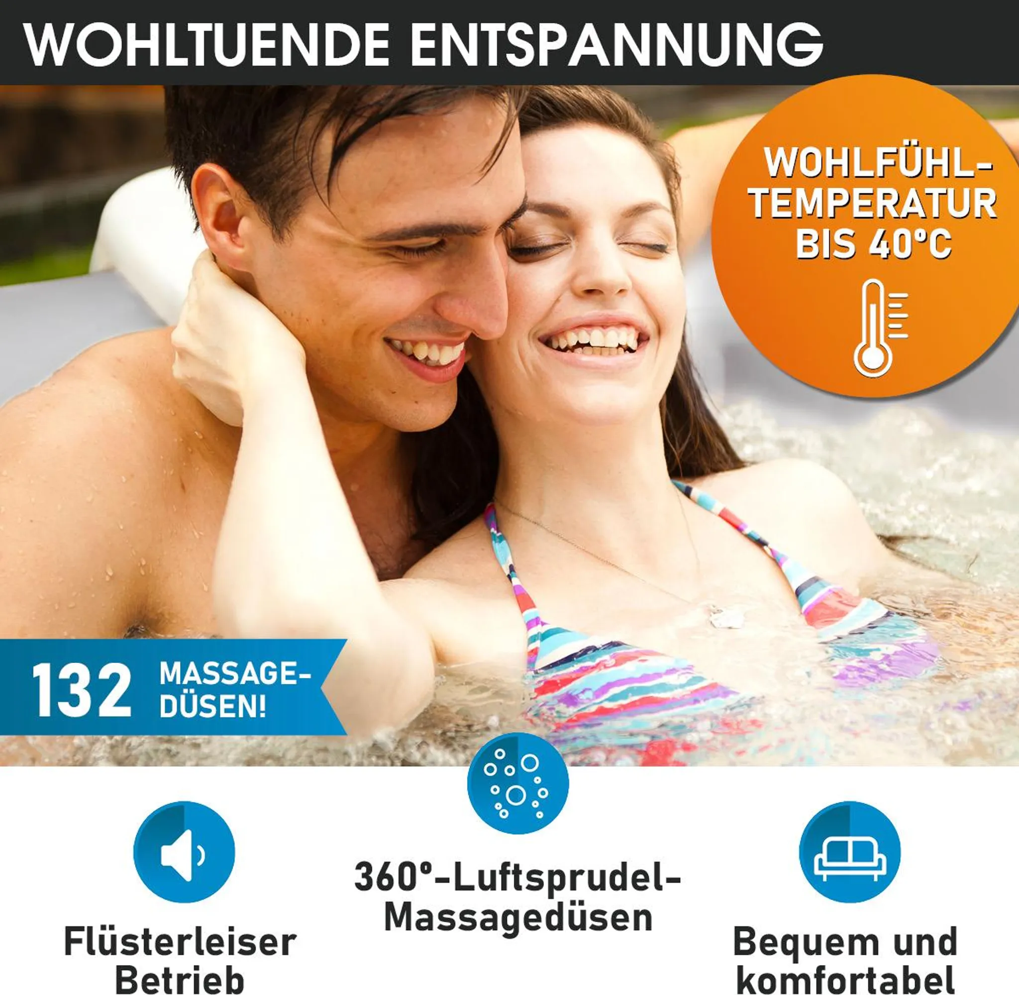Wohltuende Entspannung: Gönnen Sie sich zuhause ein erstklassiges Spa-Wellness-Erlebnis mit unserem aufblasbaren Whirlpool TEKAPO. Der Garten Whirlpool gehört zu den leisesten Modellen weltweit und bietet mit 132 Luftsprudel-Massagedüsen ein Massageerlebnis der Extraklasse, bei dem tausende Blasen für pure Entspannung sorgen. Die Wassertemperatur lässt sich bequem und präzise bis zu 40°C einstellen