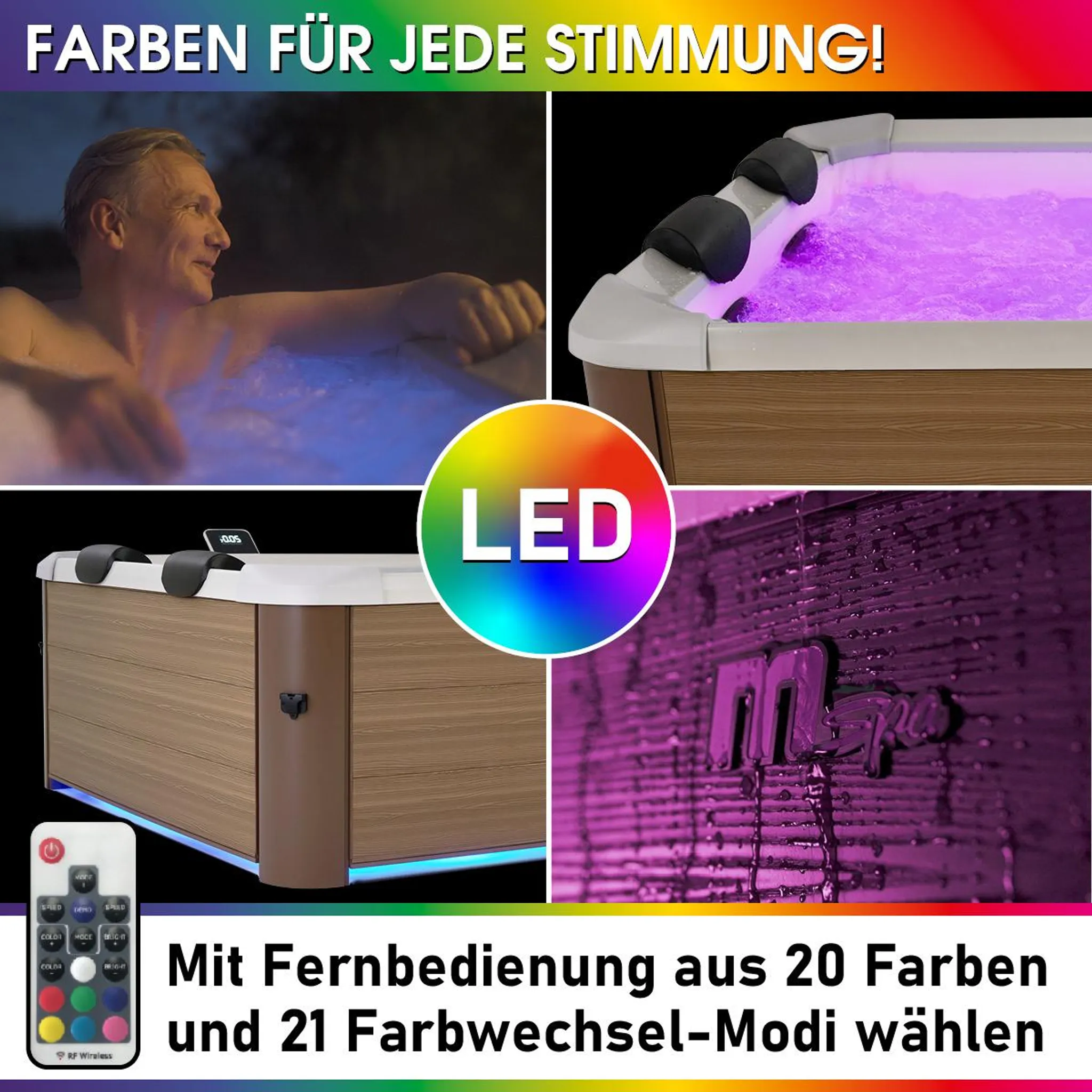 • Wohltuende Entspannung: Erleben Sie ein exklusives Wellness-Erlebnis mit unserem Garten Whirlpool OSLO AMBER mit LED-Beleuchtung und 4 integrierten Sitz-, Nacken- & Rückenkissen. Wählen Sie aus 20 Farben & 21 Farbwechsel-Modi und stellen Sie die Wassertemperatur bis 40°C nach Belieben ein. Dieser Mspa Whirlpool gehört zu den Leisesten weltweit und verwöhnt Sie mit 120 Luftsprudel-Massagedüsen mit 3 einstellbaren Intensitäten & den 8 individuell ausricht- und regelbaren Warmwasser-Jet-Düsen