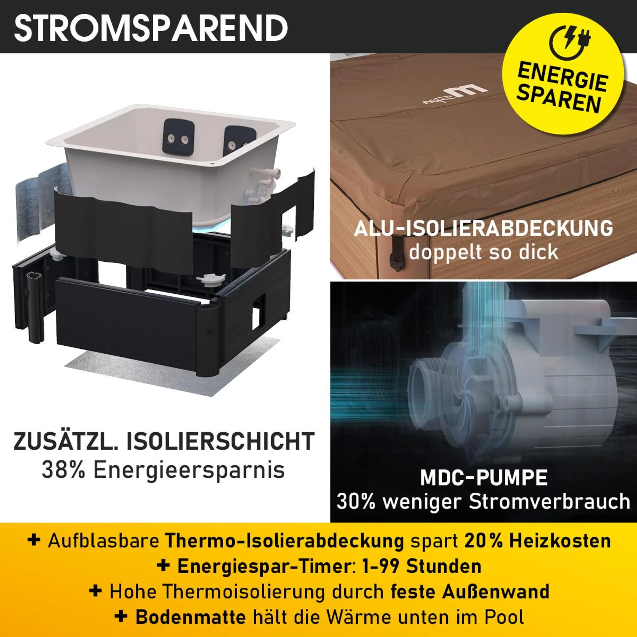 • Stromsparend: Der Außenwhirlpool verfügt über einige Technologien, die hohen Energiekosten durch stromsparende Eigenschaften entgegenwirken. Die MDC-Pumpe bietet mit 1800 l/Std 36% mehr Wasserdurchfluss bei 30% weniger Energieverbrauch. Zusätzlich helfen die Alu Isolierabdeckung, sowie die aufblasbare Thermoabdeckung, die Wärme im Pool zu halten. Die Bodenmatte isoliert von unten, sodass keine Wärme über den Boden verloren geht
