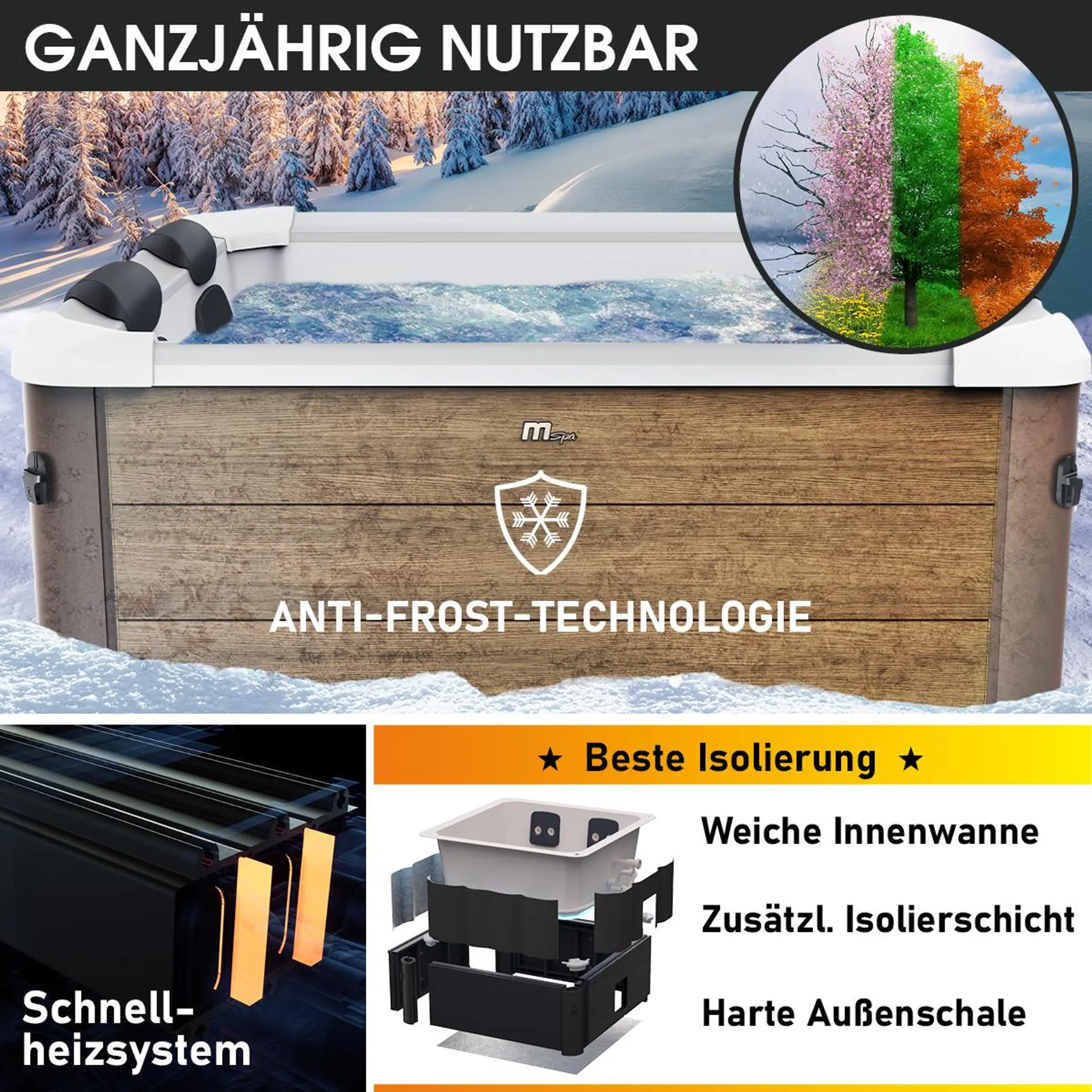 • Ganzjähriger Einsatz: Dank Anti-Frost-Technologie ist unser Outdoor-Whirlpool winterfest und ermöglicht eine ganzjährige Nutzung. Dabei wird die Heizung automatisch aktiviert, sobald die Wassertemperatur unter 1 °C fällt, und heizt auf 3 °C auf, um Frostschäden zu vermeiden.