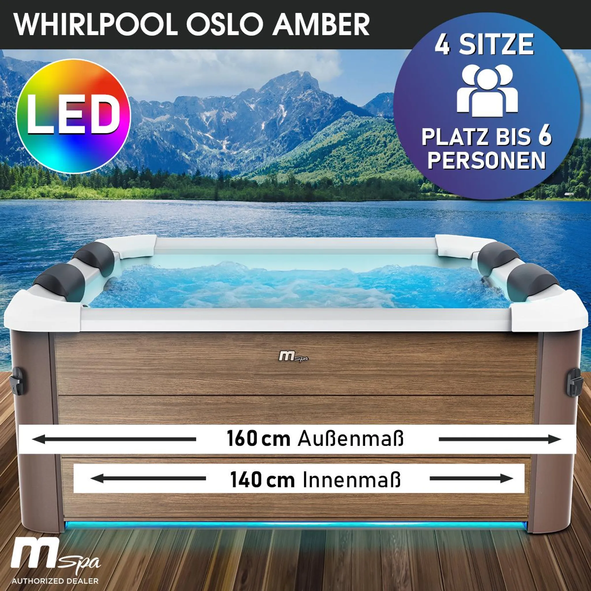 • Ihr Profi Whirlpool für Zuhause: Schaffen Sie einzigartige Wellnessmomente mit unserem Außenwhirlpool OSLO AMBER für bis zu 6 Personen. Die Steuerung der persönlichen Wellnessoase erfolgt dabei bequem über das OLED-Touchdisplay oder die erweiterte MSpa App 2.0