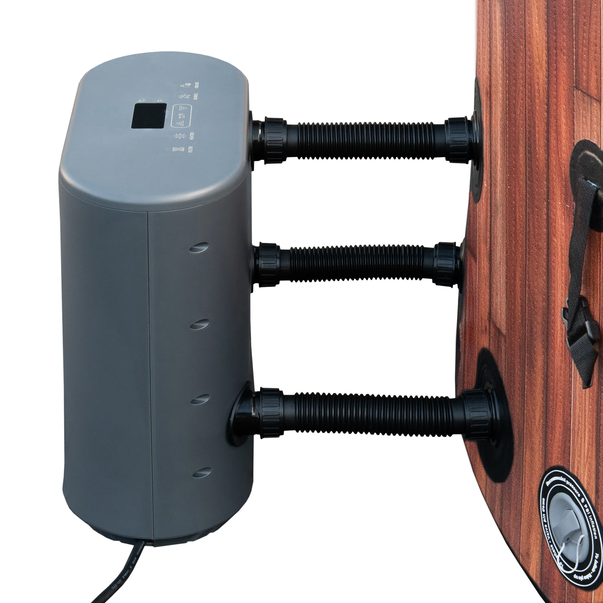 - aufblasbare Hydromassage-Badewanne mit einem Durchmesser von 175 cm und einer Höhe von 68 cm mit 138 Luftdüsen Heizung und Filterpumpe in einem Pumpe zum Aufblasen der Badewanne Schläuche: zum Pumpen, für die Filterpumpe Ventilschlüssel Ventil Rückwasserabdeckung Ablaufschlauch Badewannenabdeckung PVC-Bodenunterlage 2 Filter + Filtergehäuse Anleitung Reparaturset/Flicken