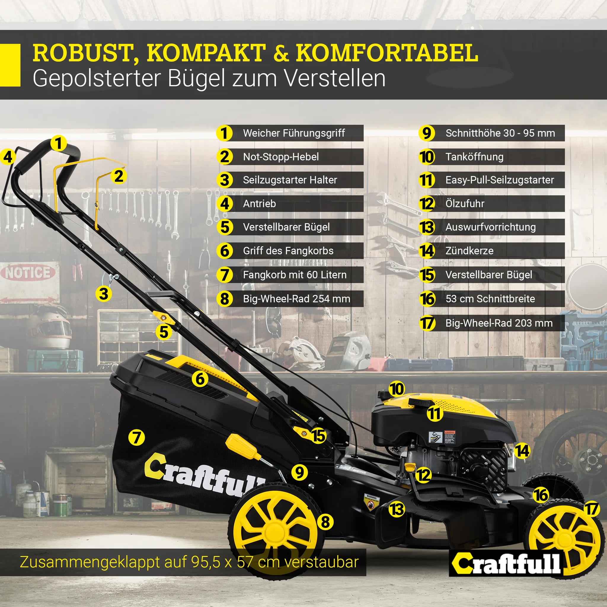 Für Sicherheit im Betrieb ist ein Sicherheitsbügel mit Totmannschalter integriert – lässt man den Hebel los, stoppt der Rasenmäher automatisch. Praktisch für Lagerung und Transport: Der Rasenmäher ist zusammenklappbar und dadurch platzsparend verstaubar. Mit einem Gewicht von ca. 30,6 kg und den großen Rädern lässt er sich zudem leicht in Schuppen oder Gartenhaus bewegen.