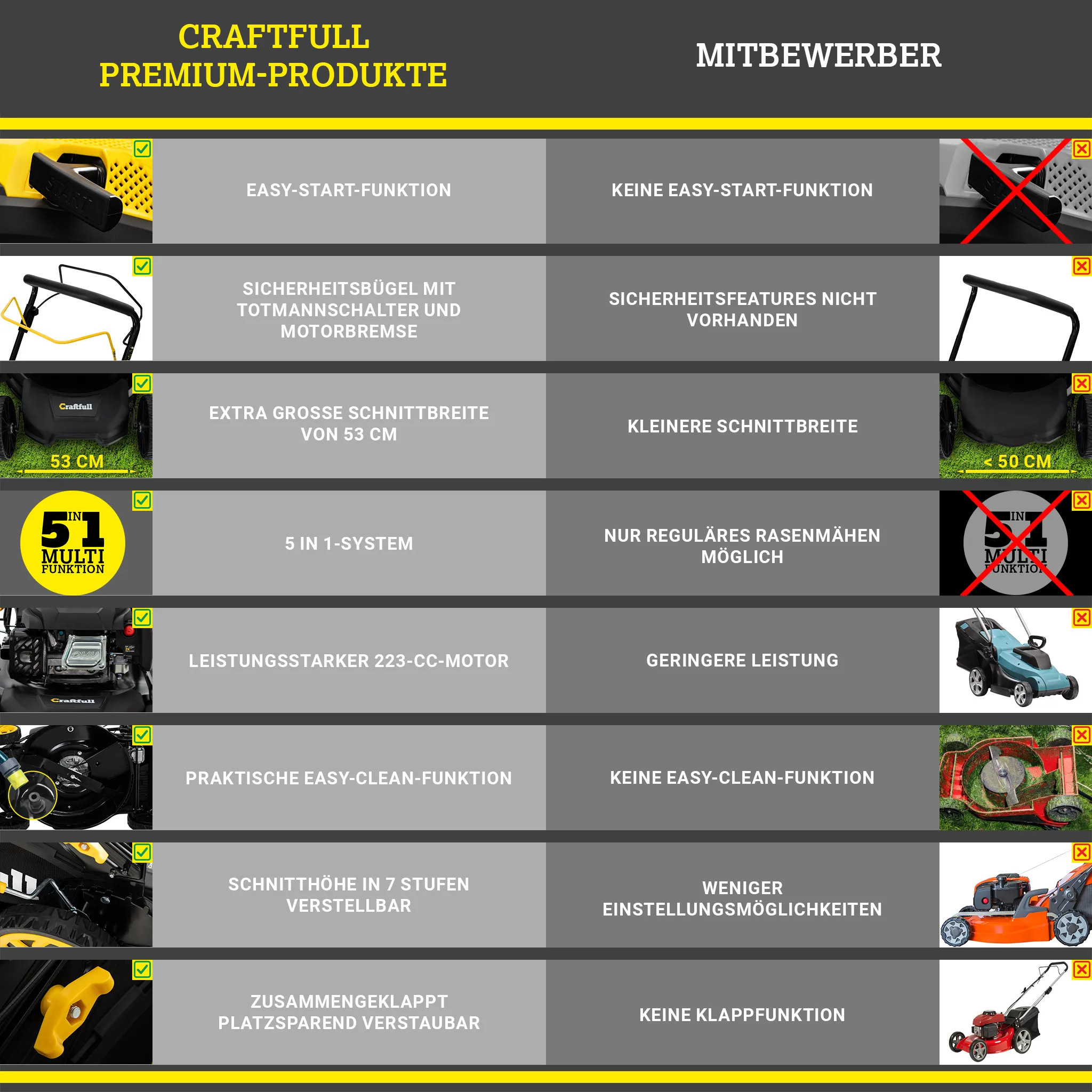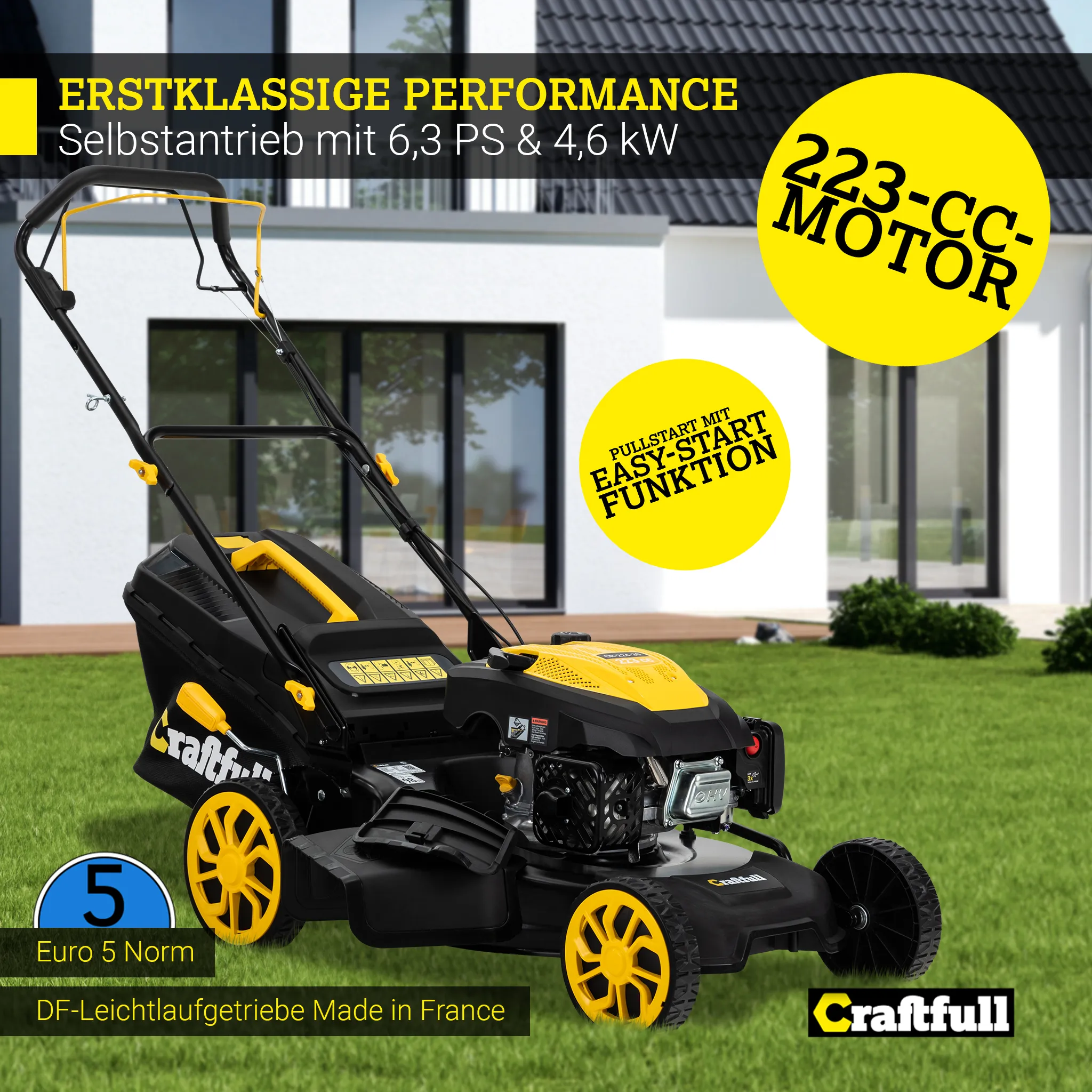 Craftfull Benzinrasenmäher CR-224-30 | Selbstfahrantrieb – Benzin Rasenmäher – Mäher – 53 cm Schnittbreite in 7 Höhenstufen – 4,2 kW/5,7 PS – 223 cm³