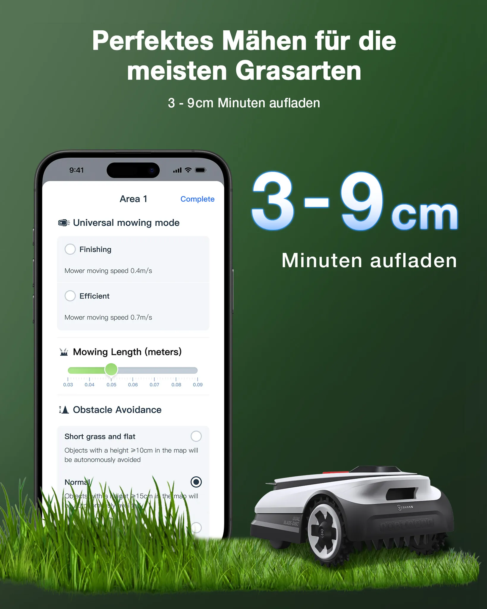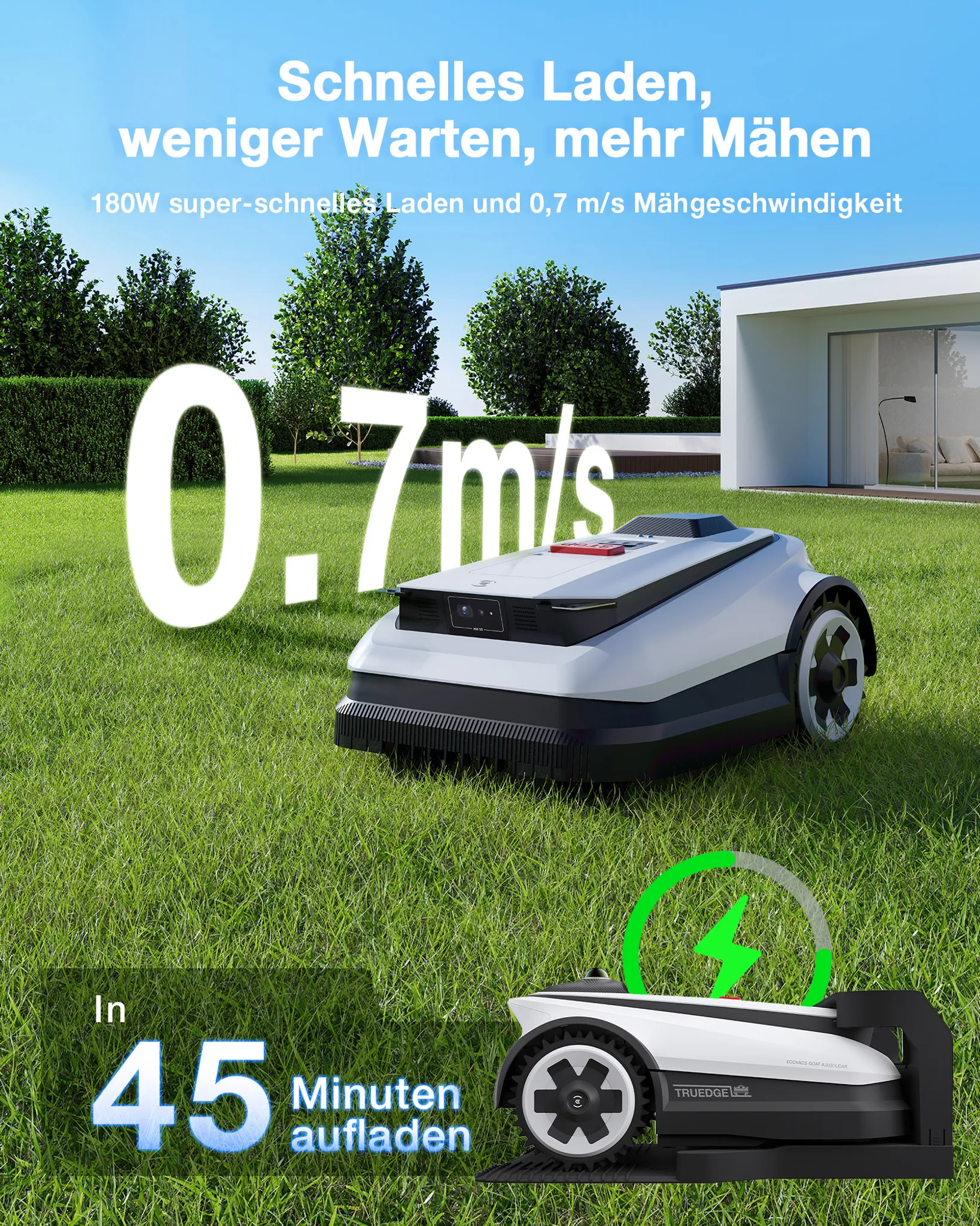 Der GOAT ist mit einer langlebigen 5Ah-Batterie ausgestattet, die ein superschnelles Aufladen ermöglicht und die Ausfallzeiten minimiert. Der Roboter kann eine Fläche von 500 m² in nur 2 Stunden mähen, einschließlich der Ladezeit.