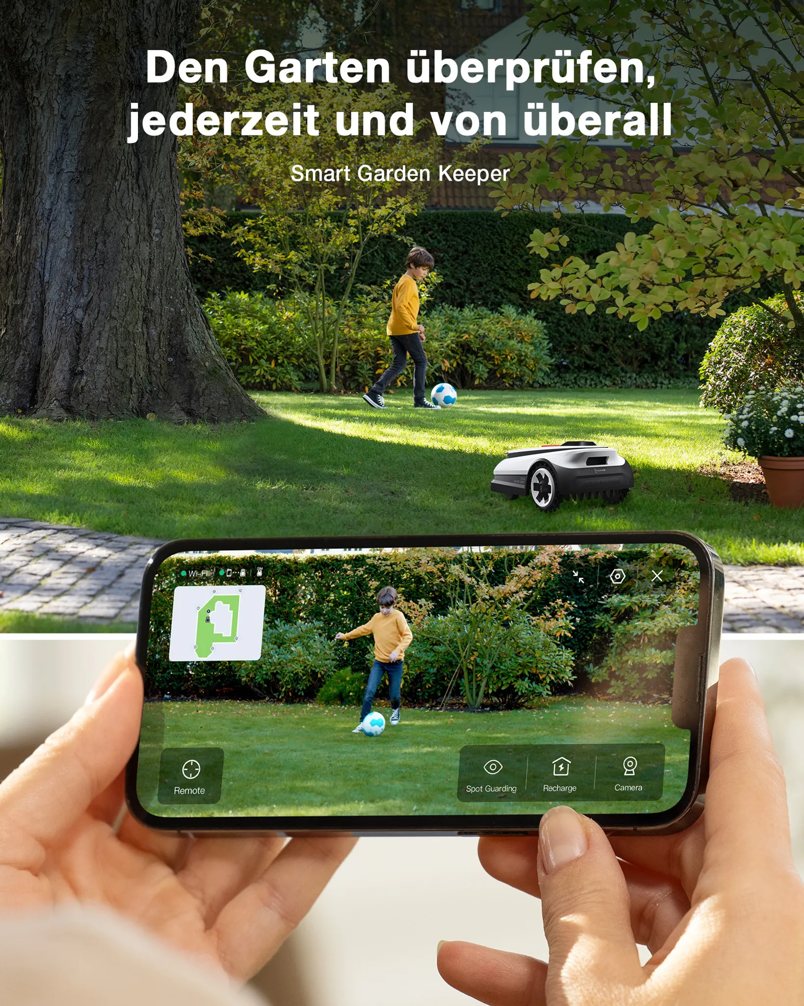 Präzise TrueEdge-Technologie für randnahes Mähen, 3D-ToF-LiDAR und KI-Kamera zur Unterscheidung von Gras- und Nicht-Grasflächen, LELS™ RTK Navigationssystem für ultrapräzise Positionierung (2 cm Genauigkeit), erkennt über 200 Gartenobjekte und weicht Hindernissen aus, automatische Kartierung ohne physische Markierungen.