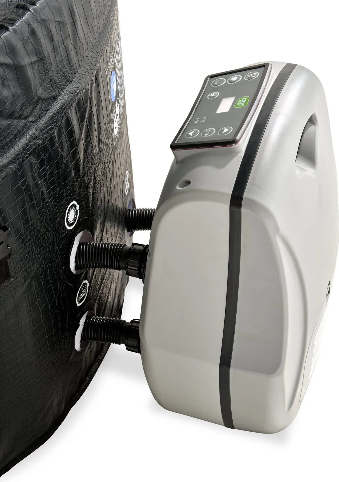 Der EXIT Leather Premium Whirlpool ø156x70cm ist ein Whirlpool, der Wellness-Feeling in den eigenen Garten bringt. Der schwarze Whirlpool wird standardmäßig mit einer Filterpumpe, die auch heizen kann, und einer isolierenden Abdeckplane geliefert. Der Whirlpool bietet Platz für zwei Personen und wirkt dank des schicken schwarzen Leder-Prints ausgesprochen edel. Der EXIT Leather Premium Whirlpool hat eine schwarze Außenseite mit Ledermuster und eine weiße Innenseite. Dieser Whirlpool hat eine Schaumstoffwand von nicht weniger als 8 Zentimetern Dicke und ist daher stabil und isolierend. Dank der Schutzfunktion des Whirlpool-Bodens ist keine separate Bodenplane erforderlich. Darüber hinaus bietet der Schaumstoffboden einen ausgezeichneten Sitzkomfort. Der Whirlpool lässt sich einfach aufbauen. Mit der isolierenden Abdeckplane inklusive Sicherheitsschloss schließt du einfach den Whirlpool ab und bleibt das Wasser warm. Der EXIT Leather Premium Whirlpool ist dank seiner Multifunktionspumpe, die das Wasser reinigt und gleichzeitig auf bis zu 40 Grad Celsius erhitzt, praktisch wartungsfrei. Mit dem digitalen Bedienfeld kannst du ganz einfach die Temperatur einstellen und die 90 Luftdüsen aktivieren, um für ordentlich Bläschen zu sorgen.