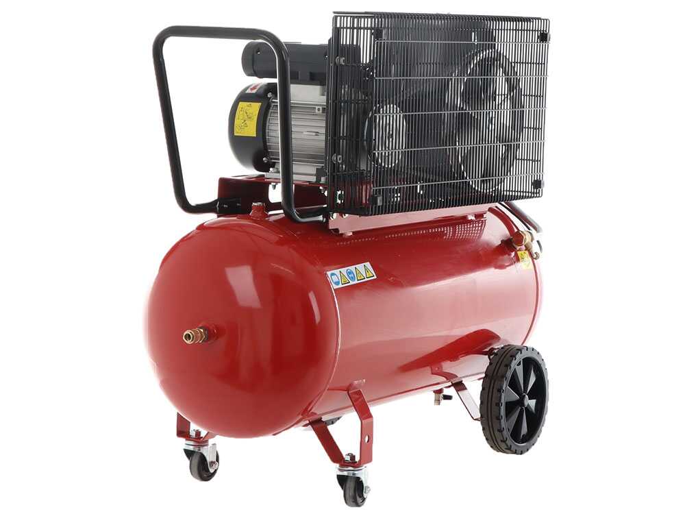 Großer Drucklufttank von 100 Litern. Der Kompressor wiegt ca. 62 kg, aber er ist mit 2 Hinterrädern und 2 vorderen Drehrädern ausgestattet, so dass er bewegt werden kann, ohne dass er angehoben werden muss. Außerdem gibt es einen Griff an der Oberseite, der den Transport noch einfacher macht.