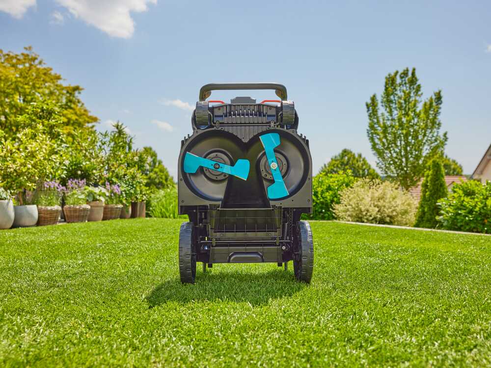 - Duoblade-System mit zwei Klingen zur Optimierung des Schnitts und der Rasensammlung.
