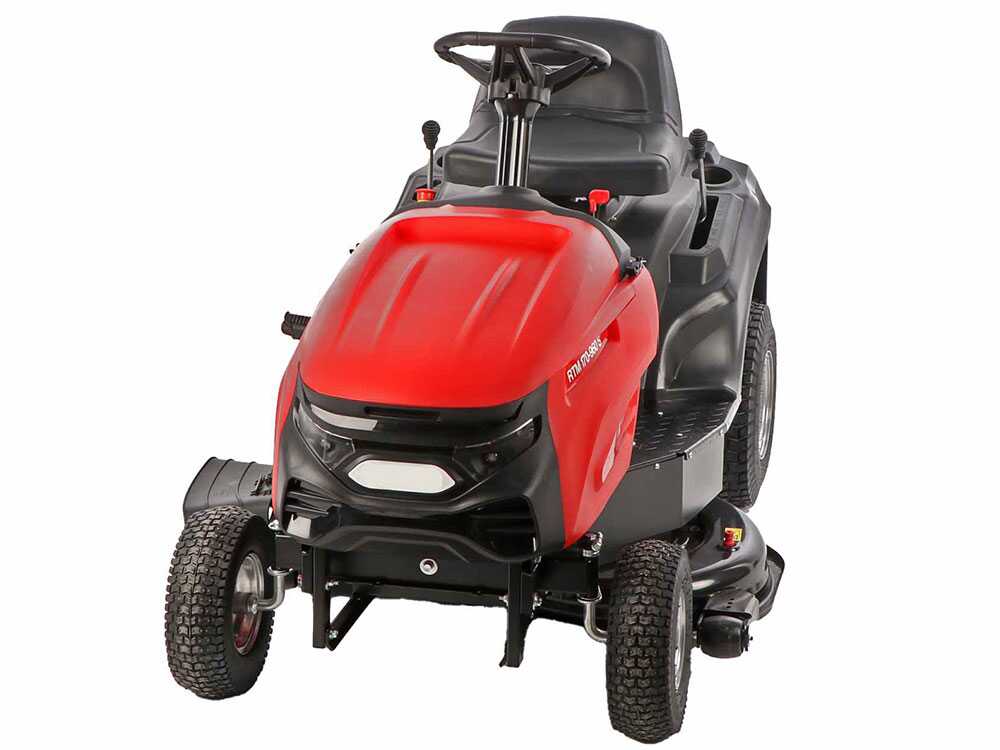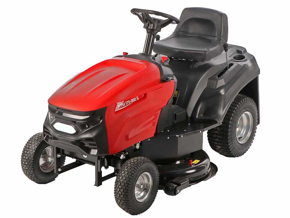 Rasentraktor GeoTech RTM 170-960 S mit Seitenauswurf und mechanischer Kraftübertragung, entwickelt um Geschwindigkeit und Manöver leicht und bequem zu bewältigen.