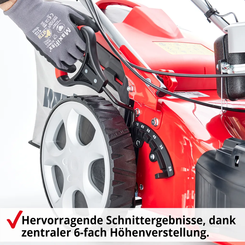 360° Bugrad für maximale Wendigkeit / 1-Gang Radantrieb mit ca. 3,3 km/h /Kugelgelagerte Räder / Großer 60 Liter Grasfangkorb mit Füllstandsanzeige / Praktische Füllstandsanzeige / Zentrale 6-fach Höhenverstellung
