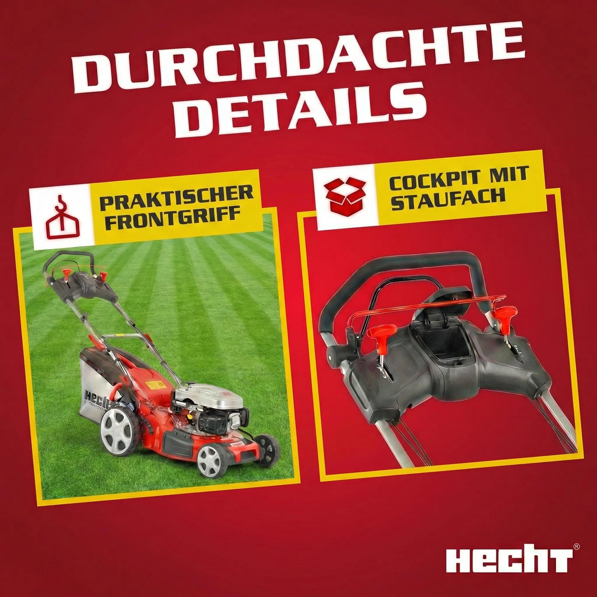 - 1 x HECHT Benzin-Rasenmäher Modell 5484 SX / 1 x Mulchkit / 1 x Seitenauswurf / 1 x 60 Liter Grasfangkorb / 1 x Motoröl 0,8 Liter SAE 10W30