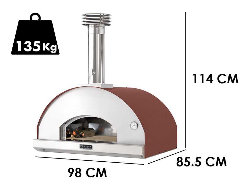 Der Fontana Gusto-Ofen verfügt über eine runde Kochkammer mit einer Tiefe von 80 cm, einer Breite von 54 cm und einer Höhe von 42 cm, die eine Gesamtkochfläche von 12960 cm bietet. Er kann bis zu 9 Pizzen auf einmal kochen und eignet sich somit perfekt für große Familientreffen oder Partys mit Freunden mit bis zu 43 Gästen. Das Kochfeld ist mit einem feuerfesten Material ausgestattet, um eine gleichmäßige Wärmeverteilung zu gewährleisten.