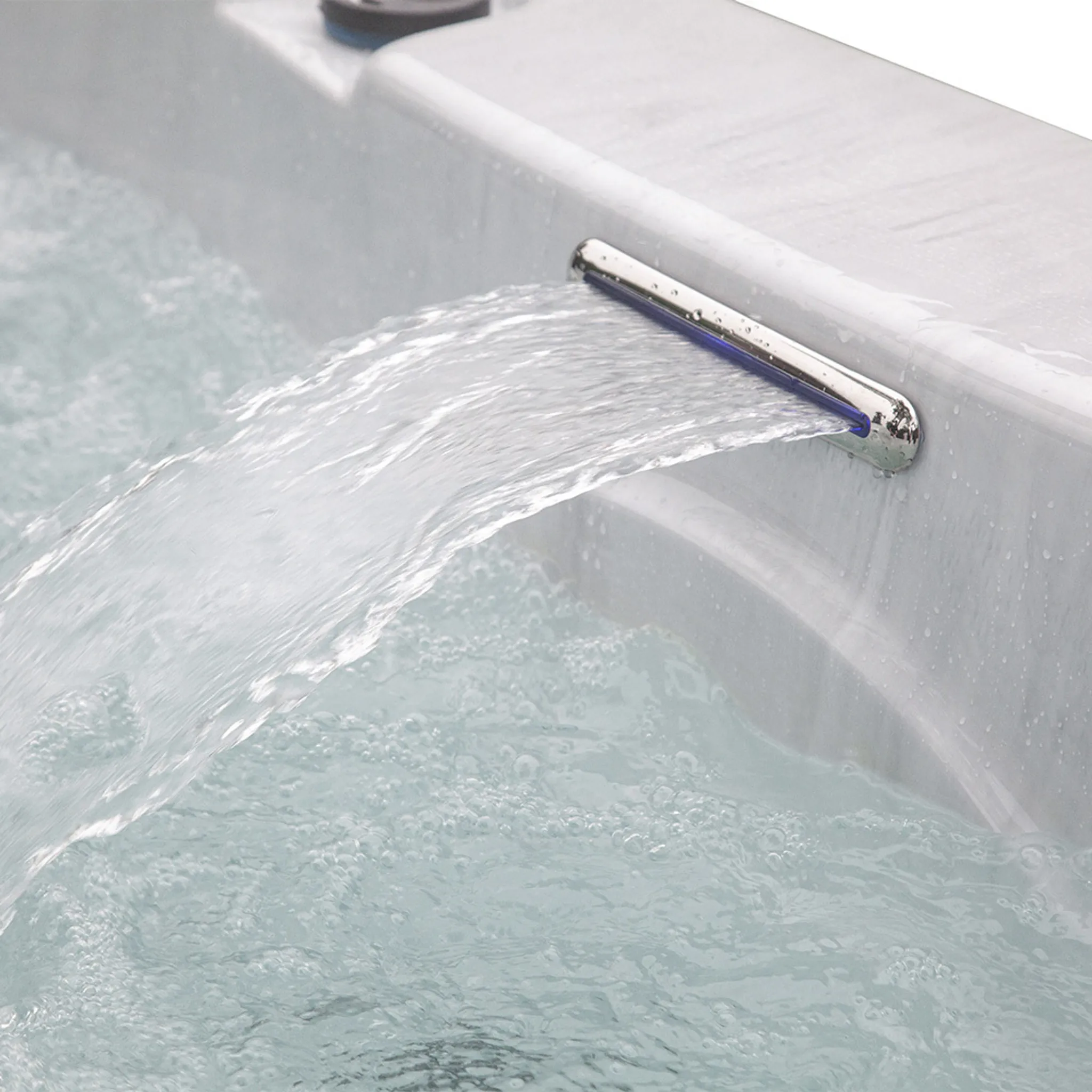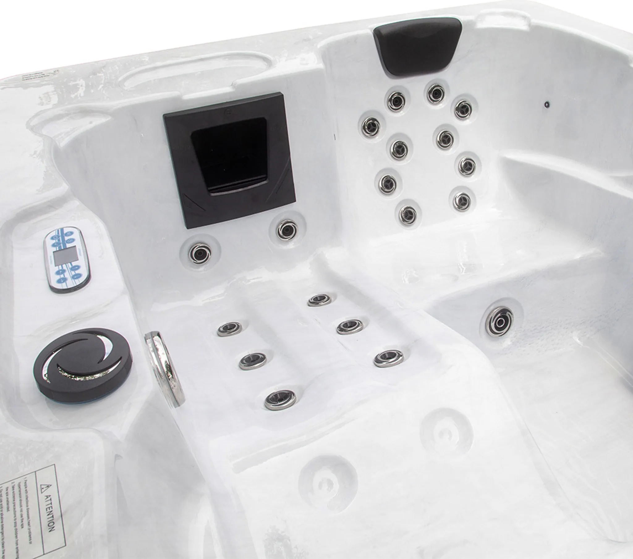 Der WHITE MARBLE Whirlpool bringt dir Entspannung genau dorthin, wo du sie brauchst – in den Garten, auf die Terrasse oder in den Wintergarten. Mit 27 kräftigen, individuell einstellbaren Düsen genießt du eine intensive Massage genau nach deinem Geschmack. Die schicke Marmoroptik der Wanne und die wetterfeste WPC-Verkleidung in Dunkelgrau machen den Pool nicht nur pflegeleicht, sondern auch zum echten Hingucker. Dank kompakter Größe passt er fast überall hin. Für stimmungsvolle Abende sorgen neun integrierte Lichtquellen mit Farbwechsel. Drei bequeme Kopfstützen machen das Sitzen oder Liegen noch angenehmer. Über das Bedienfeld steuerst du alles bequem direkt am Pool – von der Temperatur über die Massagedüsen bis zur Beleuchtung. Die leistungsstarke Pumpe lässt sich zweistufig einstellen. Insektenschutz und ein passendes Filtersystem sind bereits dabei.
