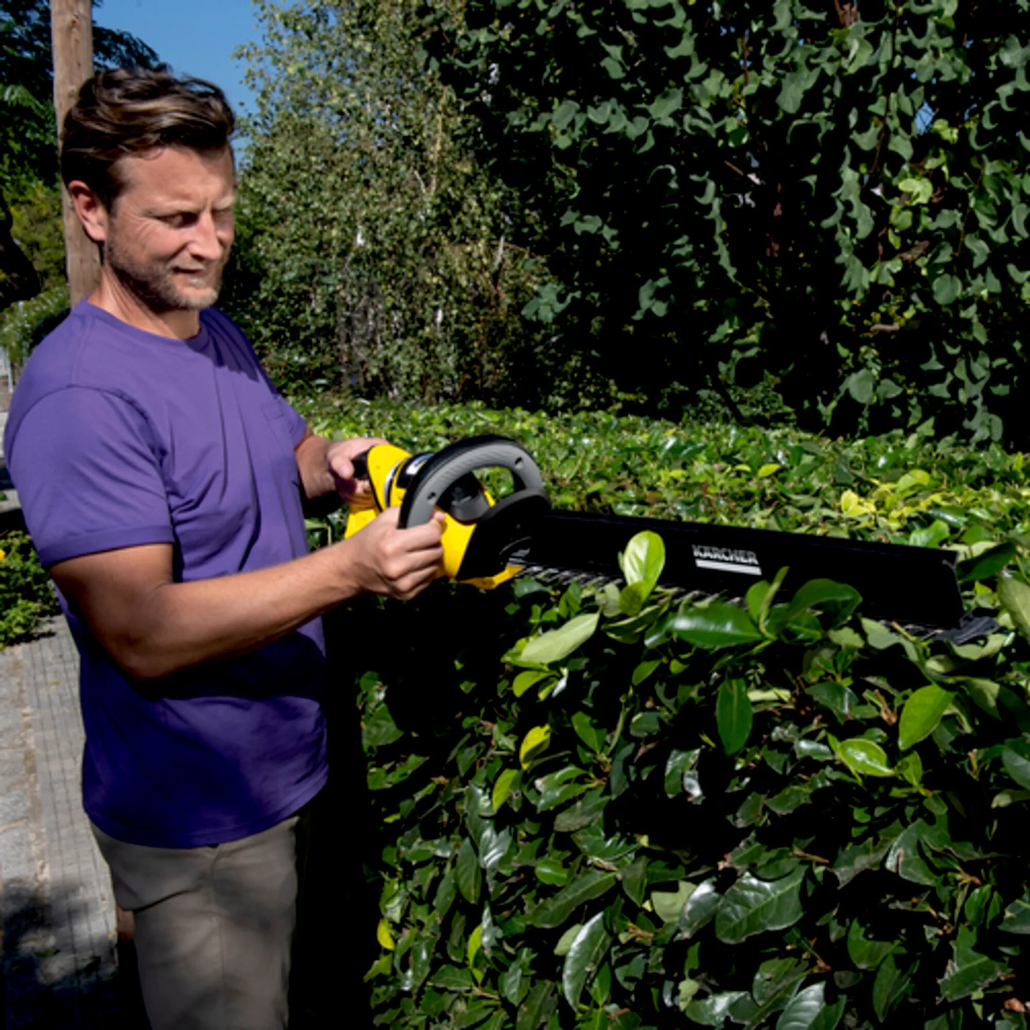 Die 36-V-Akku-Heckenschere HGE 36-60 Battery Set von Kärcher ist ein absolutes Kraftpaket. Dank der 2-stufigen Geschwindigkeitsregulierung kann je nach Anwendung zwischen maximaler Geschwindigkeit und maximaler Kraft gewählt werden. Der Handgriff lässt sich in mehreren Stufen um 180° drehen und sorgt so für komfortables Arbeiten in jeder Arbeitsposition – ganz ohne Ermüdung der Arme oder Schultern zum Beispiel beim Vertikalschnitt. Besonders praktisch ist der aufsetzbare Schnittgutkehrer. Damit fällt der Heckenschnitt nicht in die Hecke, sondern kann ganz bequem auf den Boden befördert werden. Das lasergeschnittene und diamantgeschliffene Messer hinterlässt ein sehr präzises Schnittergebnis. Der zusätzliche Messerspitzenschutz beugt sowohl Beschädigungen von Gebäuden und Böden als auch vom Messer selbst vor, und die integrierte Aufhängeöse sorgt für eine platzsparende Aufbewahrung an der Wand. Mit der Sägefunktion lassen sich auch dickere Äste mühelos schneiden. Im Lieferumfang sind ein Akku sowie ein Schnellladegerät enthalten.