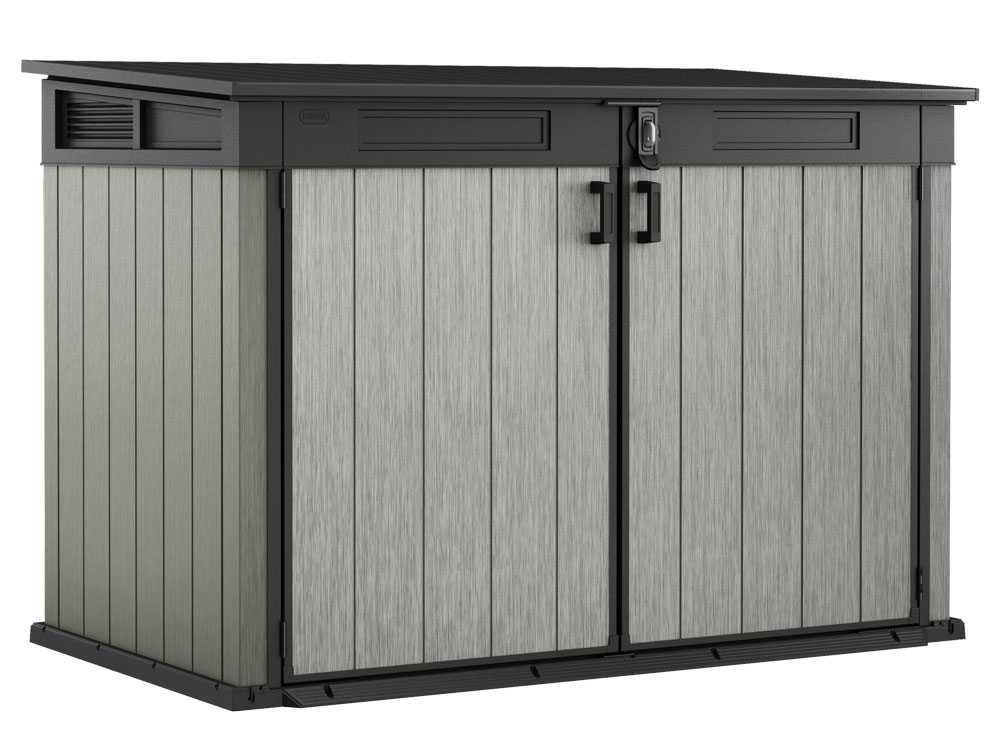 Dieser Außenschrank ist ideal für verschiedene Verwendungszwecke: die Aufbewahrung von Gartenmöbelkissen, Grills oder Gartengeräten, Fahrrädern und sogar als Stauraum von drei 240-Liter-Mülltonnen.
