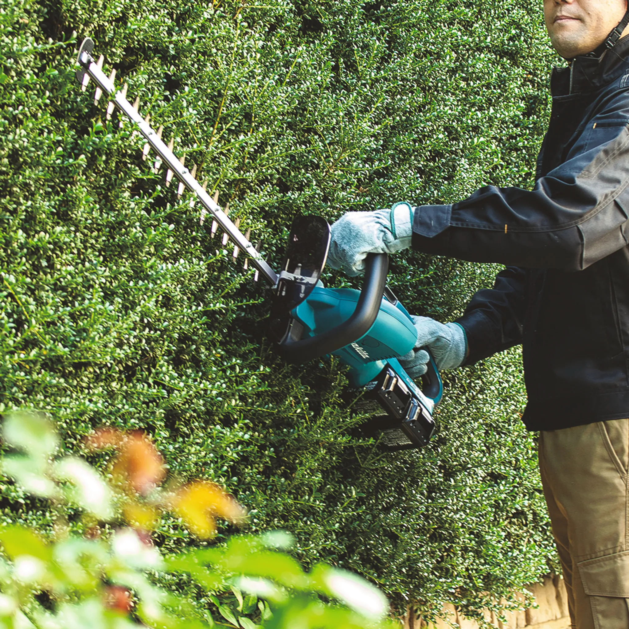 Mit der Akku-Heckenschere DUH551Z aus dem Hause Makita entscheiden Sie sich für ein professionelles Gartengerät mit vielen praktischen Extras, die für Komfort und Sicherheit bei der Arbeit sorgen. Produktmerkmale der Akku-Heckenschere DUH551Z Darum sollten Sie zugreifen: Ein regelmäßiger Form- und Rückschnitt bildet die Grundlage für ein gesundes Wachstum und eine tolle Optik Ihrer Hecken. Damit dieser mühelos gelingt, sollten Sie auf hochwertiges Werkzeug wie die Heckenschere DUH551Z von Makita setzen. Das Modell mit gegenläufigen Schneidmessern und Überkopfschalter verfügt über eine solide Schnittlänge von 55 cm. Sie können damit Äste und Zweige bis zu einer Stärke von 18 mm schneiden, wobei ein Anstoßschutz Rückschläge verhindert. Besonders komfortabel gelingt der Heckenschnitt aufgrund des clever konzipierten hinteren Handgriffs. Diesen können Sie in fünf unterschiedlichen Stellungen einrasten lassen. Zusammen mit dem vorderen Griff ist die Heckenschere außerdem präzise führbar. Darüber hinaus lässt sich die Drehzahl der Heckenschere je nach Projekt variieren. Das ausbalancierte Design verhindert zudem ein schnelles Ermüden. Im Set ist ein Aufbewahrungsbehälter als Messerschutz bereits enthalten. Ihre neue Heckenschere DUH551Z wird mithilfe zweier Akkus mit einer Spannung von 18 V betrieben und ist dadurch ein echtes Kraftpaket mit langer Ausdauer. Die Lithium-Ionen-Akkus sind schnell aufgeladen und verfügen über einen integrierten Schutz vor Tiefentladung, Überhitzung und Überlastung. Bitte beachten Sie, dass Ihnen die Heckenschere in diesem Set ohne Akku und Ladegerät geliefert wird. Das ist gerade dann attraktiv, wenn Sie bereits im Besitz anderer Geräte von Makita sind, die mit einem 18-V-Akku betrieben werden. Sie können die Akkus und die passenden Werkzeuge einer Akku-Familie nämlich problemlos miteinander kombinieren. Ansonsten sind die beiden passenden Akkus mit der von Ihnen gewünschten Kapazität sowie das Ladegerät separat erhältlich. Dank der akkubetriebenen Heckenschere DUH551Z mit einer Schnittlänge von 55 cm und einer Schnittstärke von 18 mm geht die Arbeit gut von der Hand. Dafür sorgen der fünffach positionsverstellbare Handgriff, ein zusätzlicher Griff, die variierbare Drehzahl, der Überkopfschalter sowie ein Anstoßschutz vor Rückschlägen. Festgenagelt: Die Akku-Heckenschere DUH551Z von Makita punktet mit ihrer Ausstattung in Profiqualität.