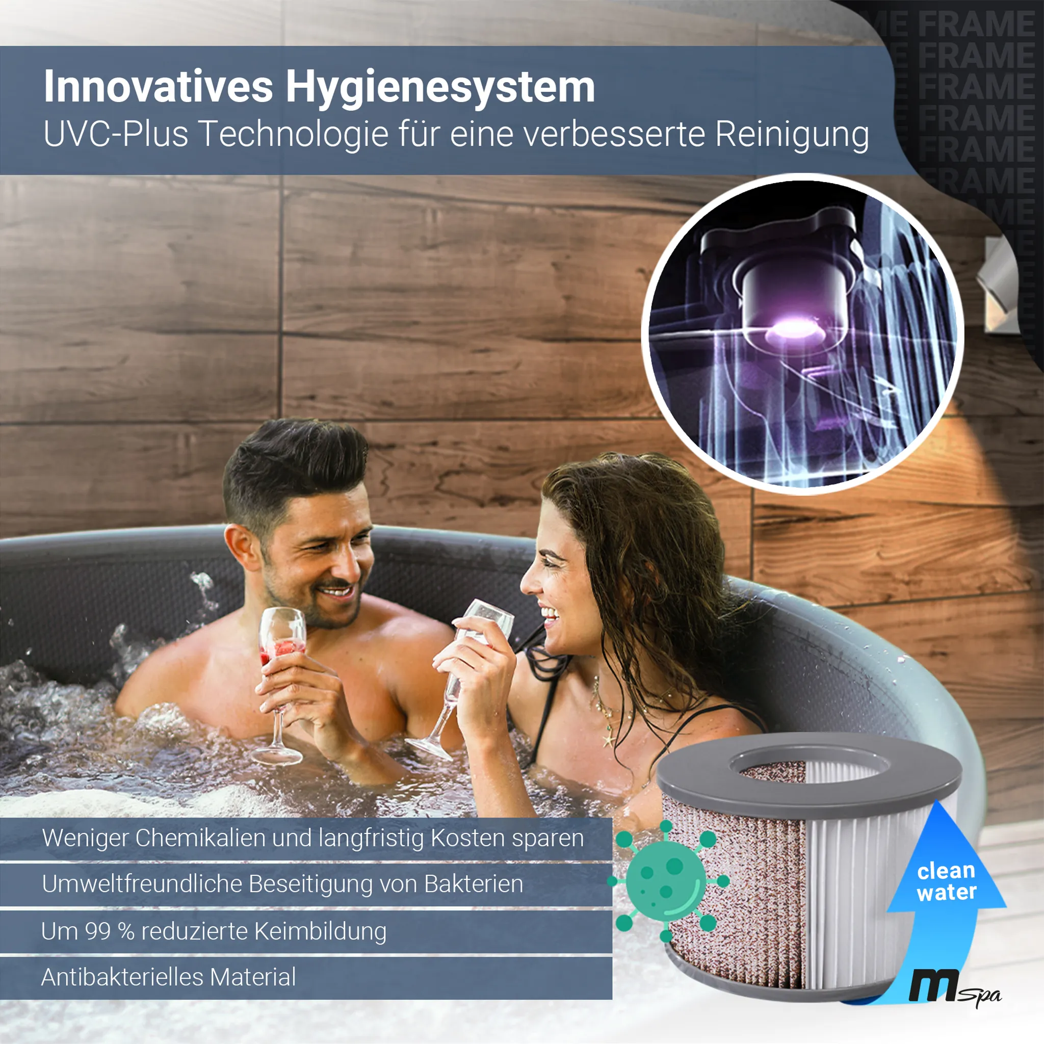 • Effiziente Wasserreinigung Dank 20-fach effektiver UVC⁺-Technologie bleibt das Wasser hygienisch rein – ganz ohne chemische Zusätze.