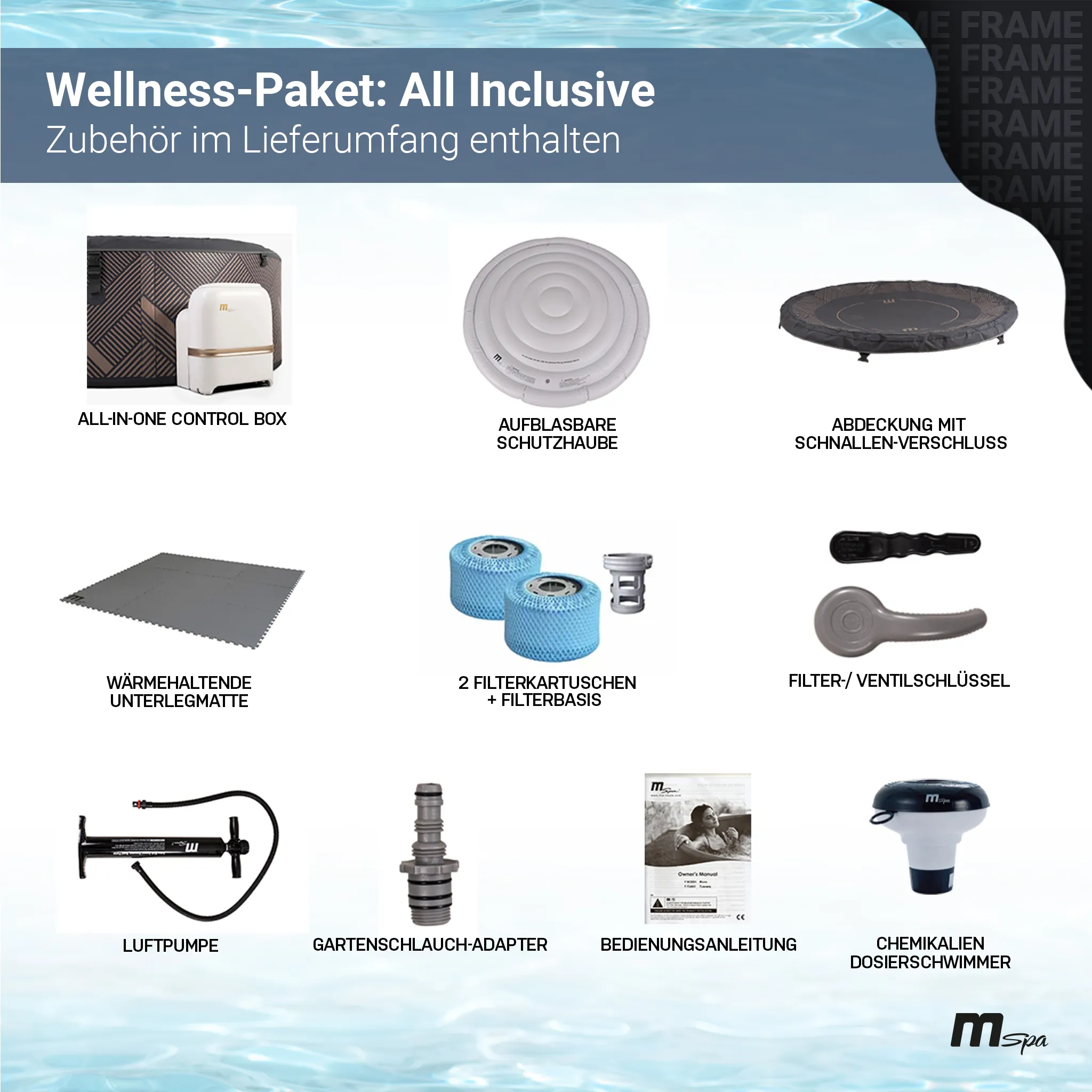 • Komplettes Zubehörpaket Inkl. Abdeckung, Dosierschwimmer, Wärmematte, Filterkartuschen, Handpumpe & Füllzubehör.