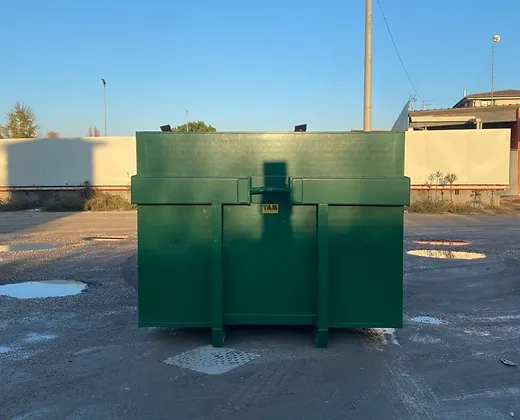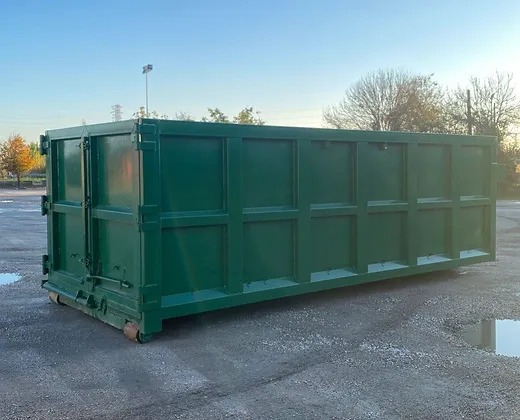Ein grüner, offener Container mit hinteren Doppelflügeltüren, perfekt für die Entsorgung sperriger Abfälle.