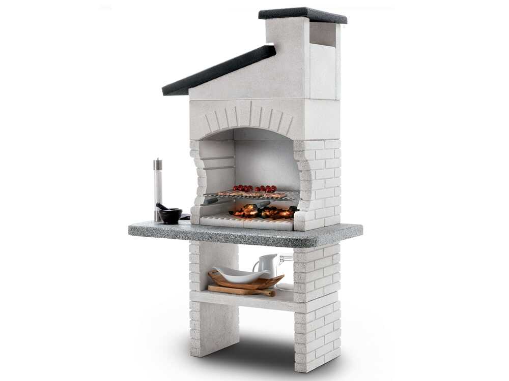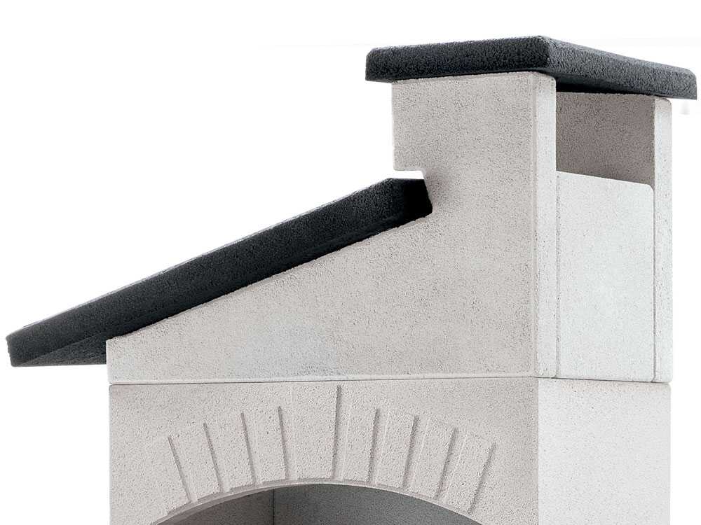 Das Modell verfügt über mehrere praktische Ablageflächen für die Kochutensilien. Die große Arbeitsplatte mit poliertem grauem Graniteffekt und die Seiten des Kamins in Ziegelsteinoptik, sind beide aus Marmotech.
