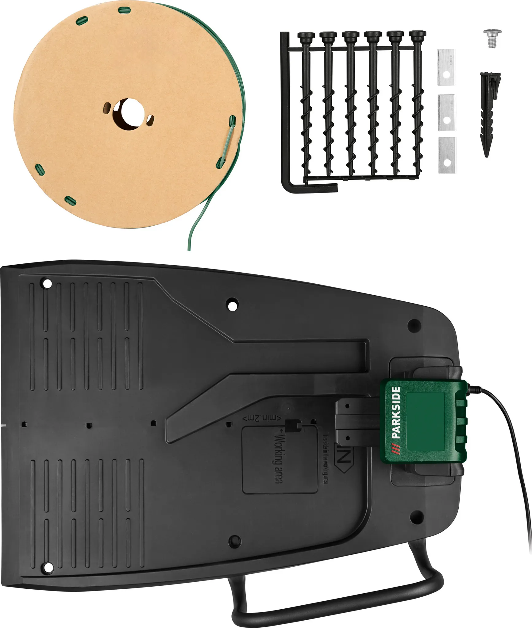 - Ladegerät, Akku, Ladestation, Begrenzungshaken, Ersatzmesser