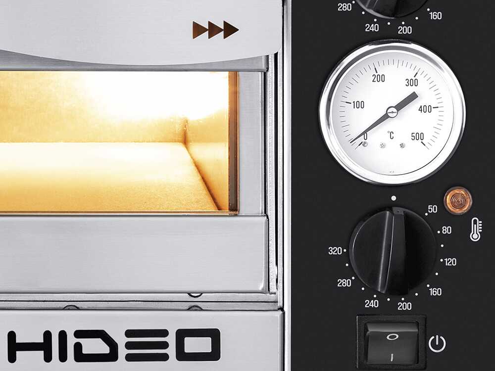 Der leistungsstarke Pizzaofen Prismafood HIDEO 2/40 ist mit doppelten mechanischen Bedienelementen für jede Kammer ausgestattet. Jede Kammer verfügt über einen separaten Thermostat zur unabhängigen Steuerung des oberen (Decke) und unteren (Boden) Heizelements und ermöglicht eine präzise Einstellung der Temperatur bis zu 320 °C.