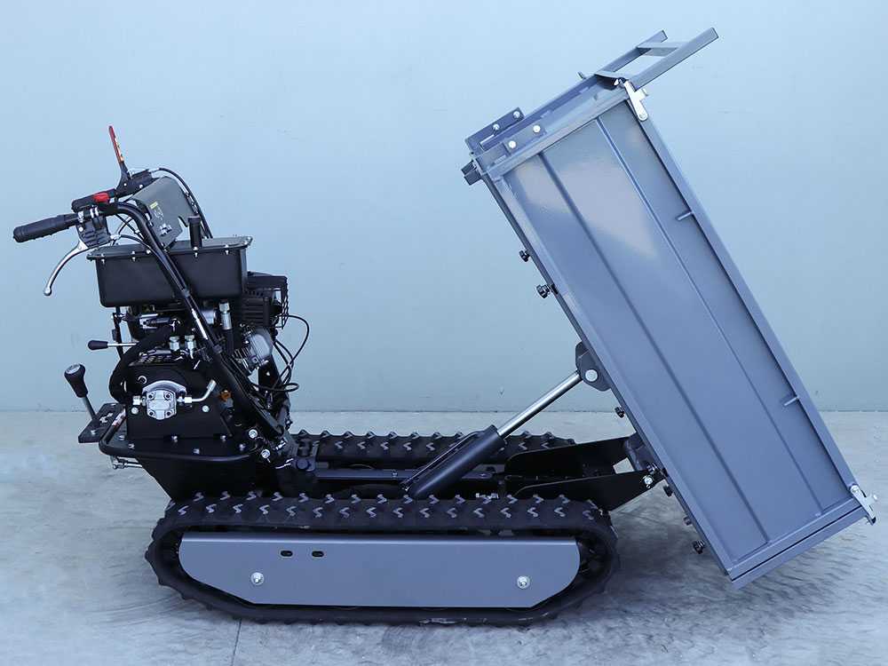 Der Transporter hat einen Euro 5 Loncin G210F Motor mit einem Hubraum von 212 cm³. Nennleistung 7 PS. Der robuste Stahlrahmen und das Getriebe mit 3 Vorwärtsgängen und 1 Rückwärtsgang machen den Raupentransporter besonders vielseitig und leistungsfähig.