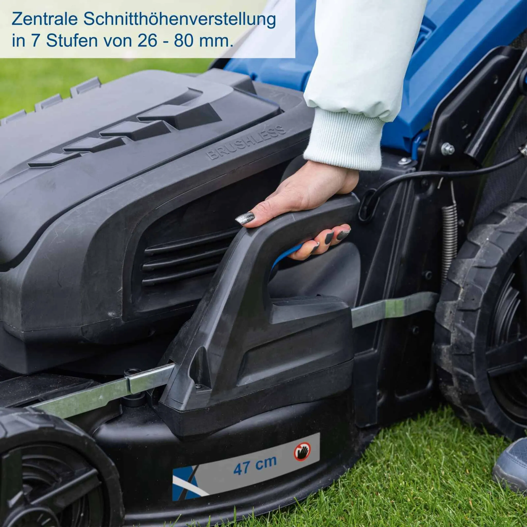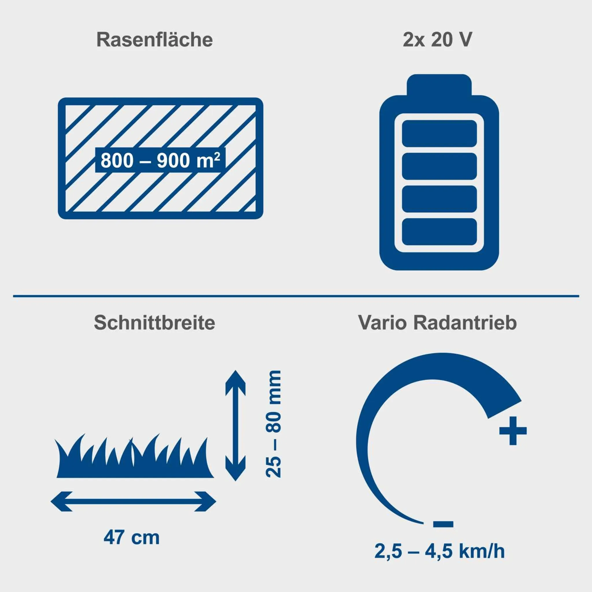 • Leistungsstarker Akku-Rasenmäher mit 47 cm Schnittbreite für Gärten mit 800 – 900 m2