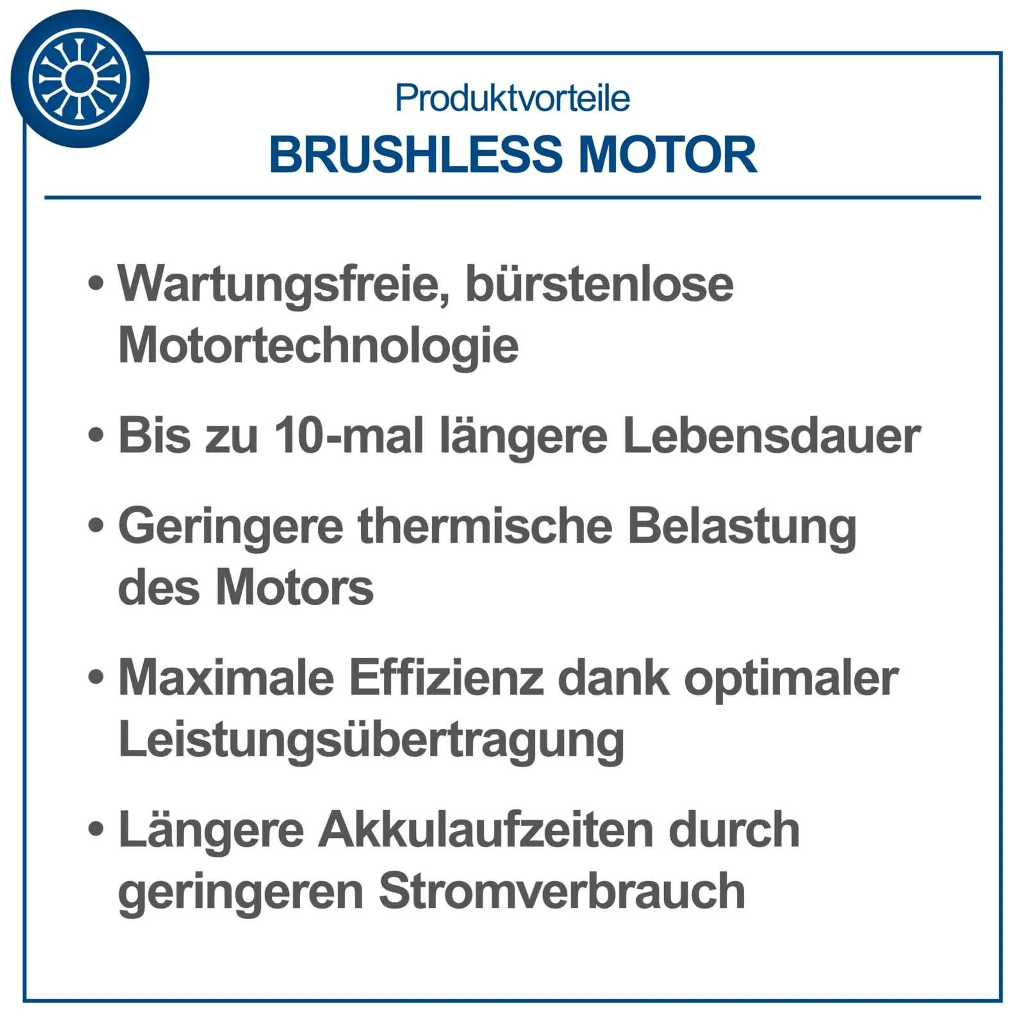 • Wartungsfreier, bürstenloser Motor (Brushless Motor) mit besonders hohem Wirkungsgrad, längerer Laufzeit, hoher Lebensdauer und geringem Verschleiß