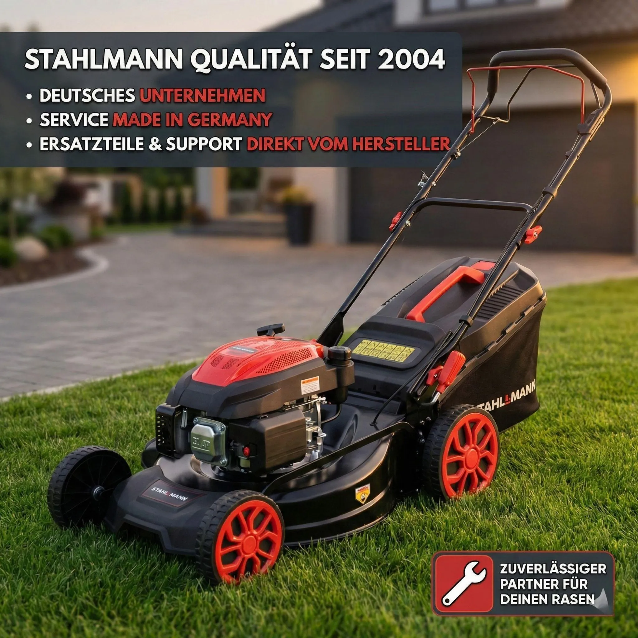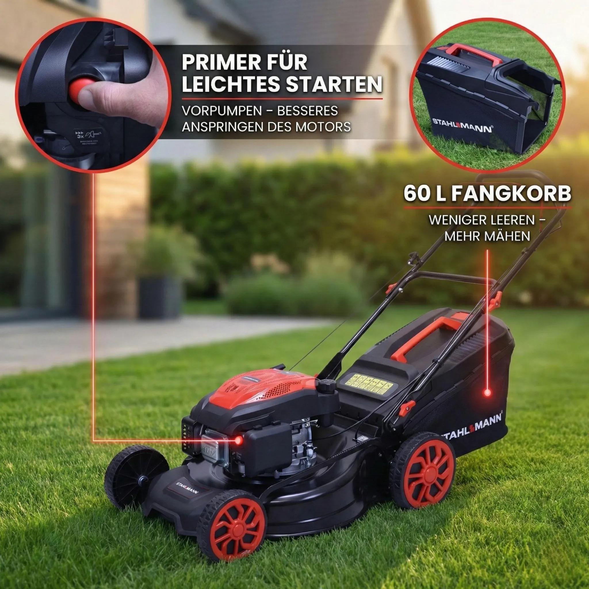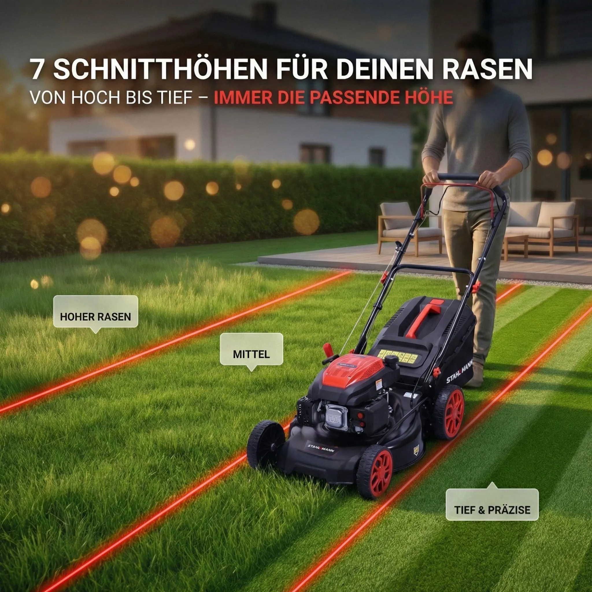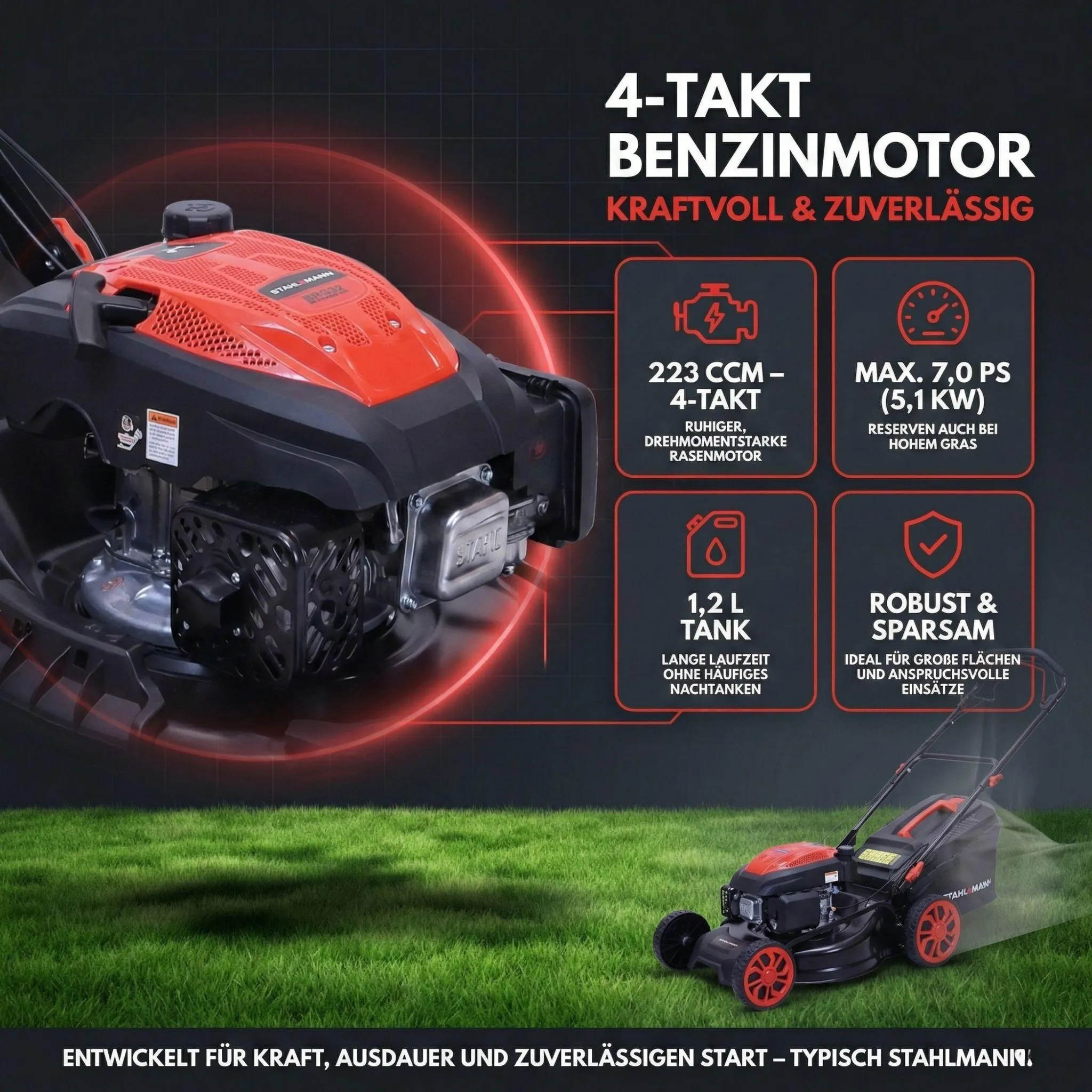 Max. 7,0 PS MOTOR – LEISTUNGSSTARK & ZUVERLÄSSIG: Der Stahlmann Rasenmäher besitzt einen starken und zuverlässigen Motor mit Dauernennleistung 5,7PS (4,2kW) Leistung und Max. Leistung 7,0PS (5,1Kw). So wird auch das Mähen von hohen und nassen Gräsern zum Kinderspiel.