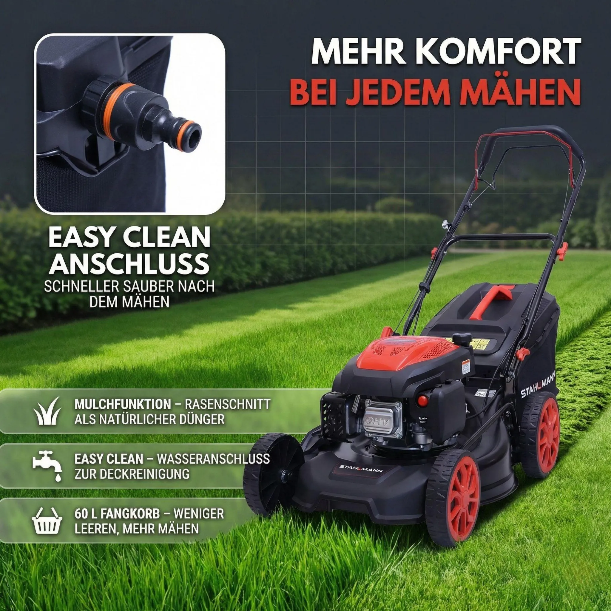 Mulchen, Seitenauswurf, Radantrieb, zentrale Schnitthöhenverstellung, Easy Clean, Clean-Clean-Clean-Anschluss, klappbarer Handgriff