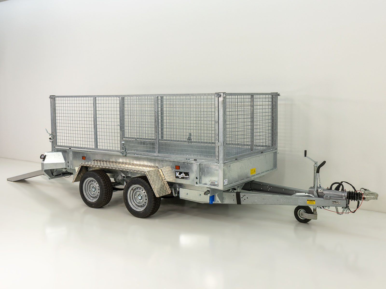 Ein leistungsstarker Heckkipper mit hoher Nutzlast, ideal für schwere Lasten. Ausgestattet mit einem Gitteraufsatz und einer stabilen Stahl-Bordwand.