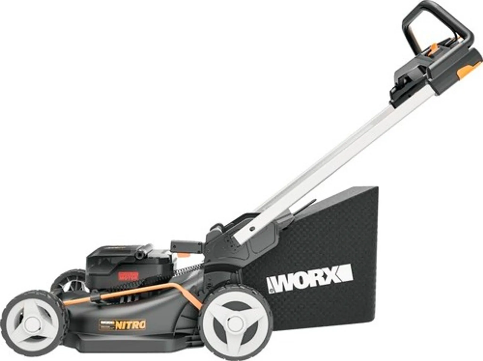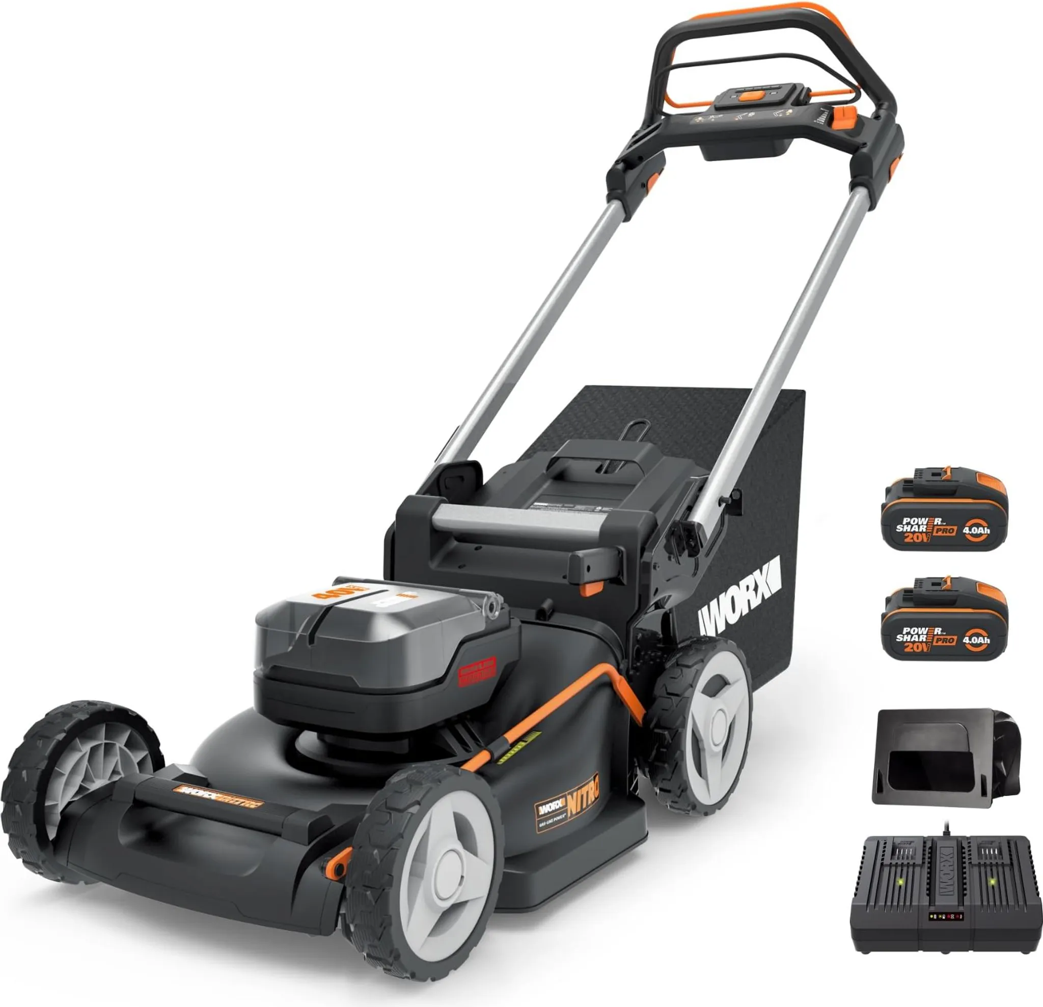 • Lieferumfang: WG749E NITRO Akku-Rasenmäher, 2 x 4Ah Akkus, 4A Dual-Schnellladengerät, Grassammelbeutel, 46cm Mähmesser, Mulcheinsatz